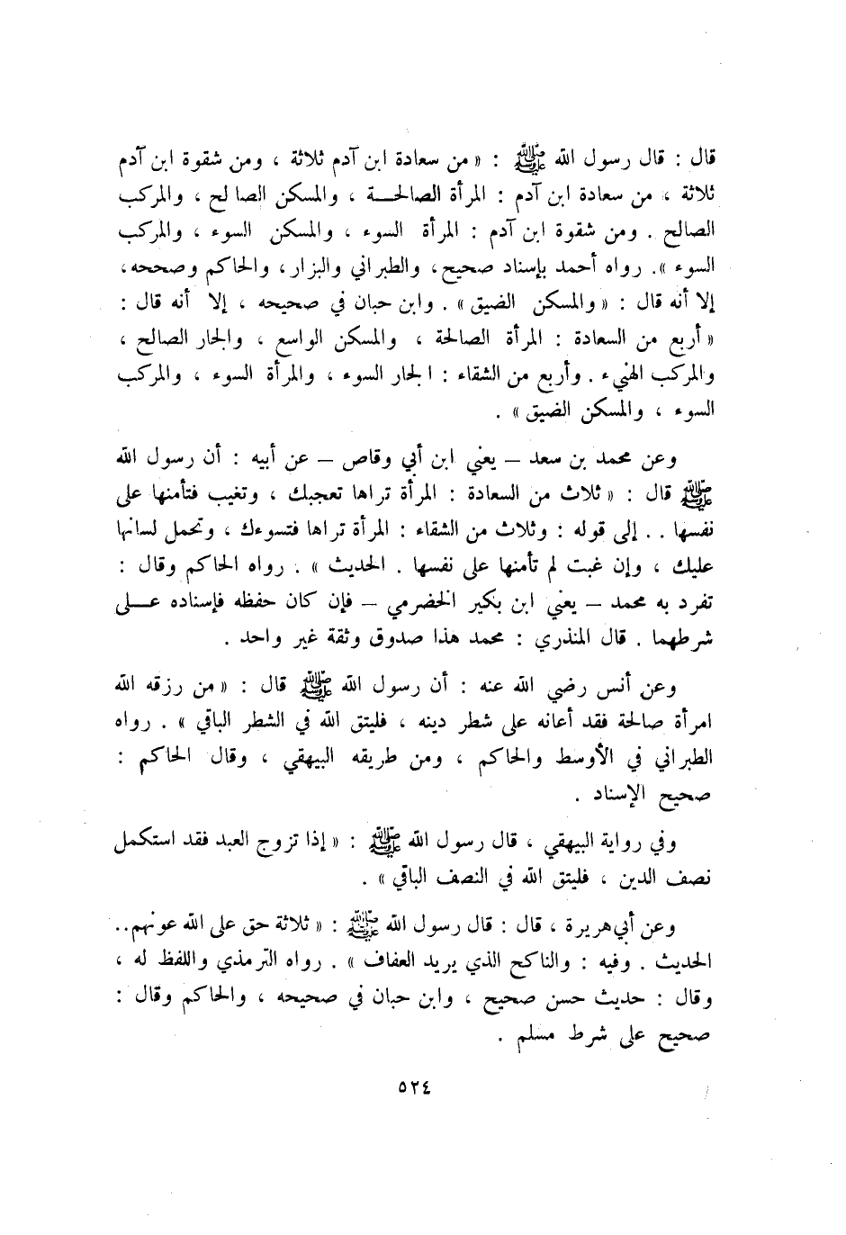 قَالَ قَالَ رَسُول الله صلى الله عَلَيْهِ وَسلم من سَعَادَة ابْن آدم ثَلَاثَة وَمن شقوة ابْن آدم ثَلَاثَة من سَعَادَة ابْن آدم الْمَرْأَة الصَّالِحَة والمسكن الصَّالح والمركب الصَّالح وَمن شقوة ابْن آدم الْمَرْأَة السوء والمسكن السوء والمركب السوء رَوَاهُ أَحْمد بِإِسْنَاد صَحِيح وَالطَّبَرَانِيّ وَالْبَزَّار وَالْحَاكِم وَصَححهُ إِلَّا أَنه قَالَ والمسكن الضّيق وَابْن حبَان فِي صَحِيحه إِلَّا أَنه قَالَ أَربع من السَّعَادَة الْمَرْأَة الصَّالِحَة والمسكن الْوَاسِع وَالْجَار الصَّالح والمركب الهنيء وَأَرْبع من الشَّقَاء الْجَار السوء وَالْمَرْأَة السوء والمركب السوء والمسكن الضّيق