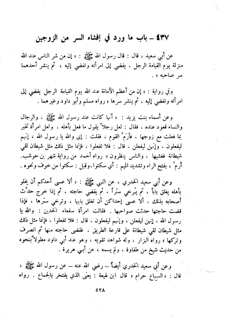 437 - بَاب مَا ورد فِي إفشاء السِّرّ من الزَّوْجَيْنِ