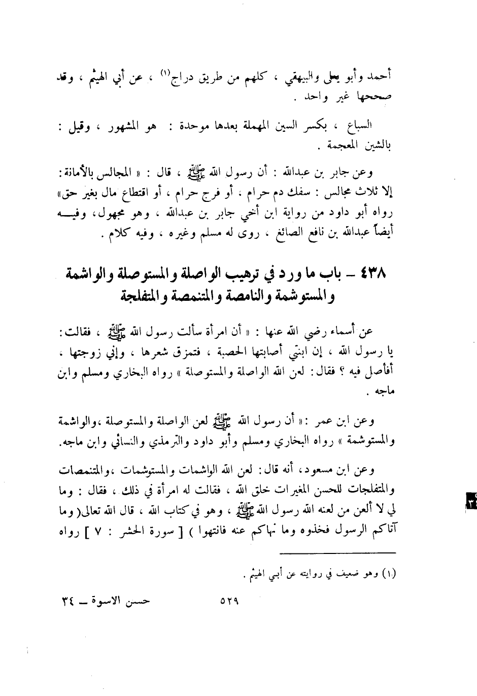 438 - بَاب مَا ورد فِي ترهيب الْوَاصِلَة وَالْمسْتَوْصِلَة والواشمة والمستوشمة والنامصة والمتنمصة والمتفلجة