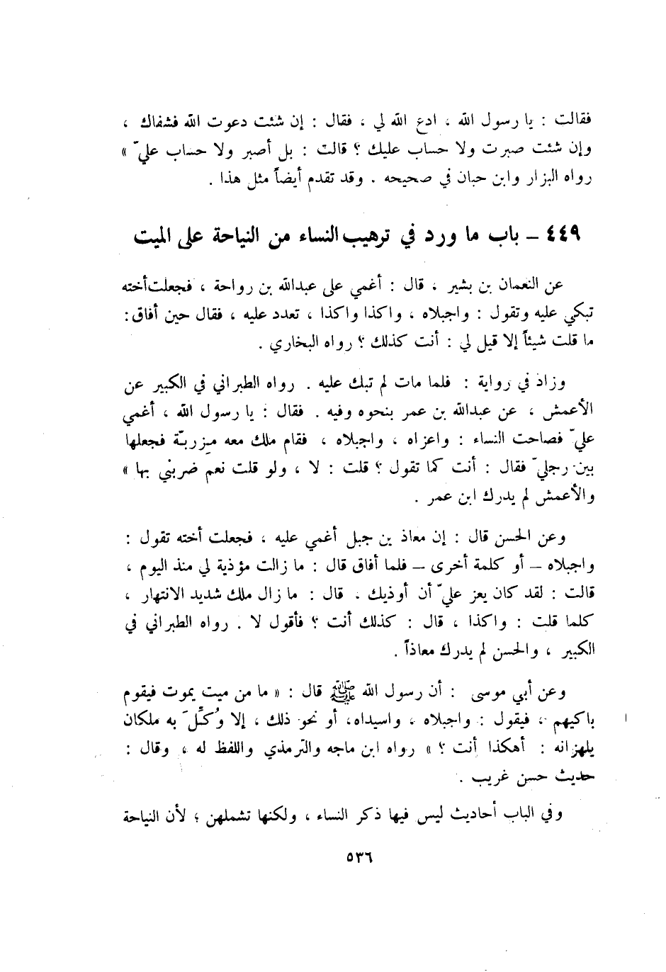 449 - بَاب مَا ورد فِي ترهيب النِّسَاء من النِّيَاحَة على الْمَيِّت