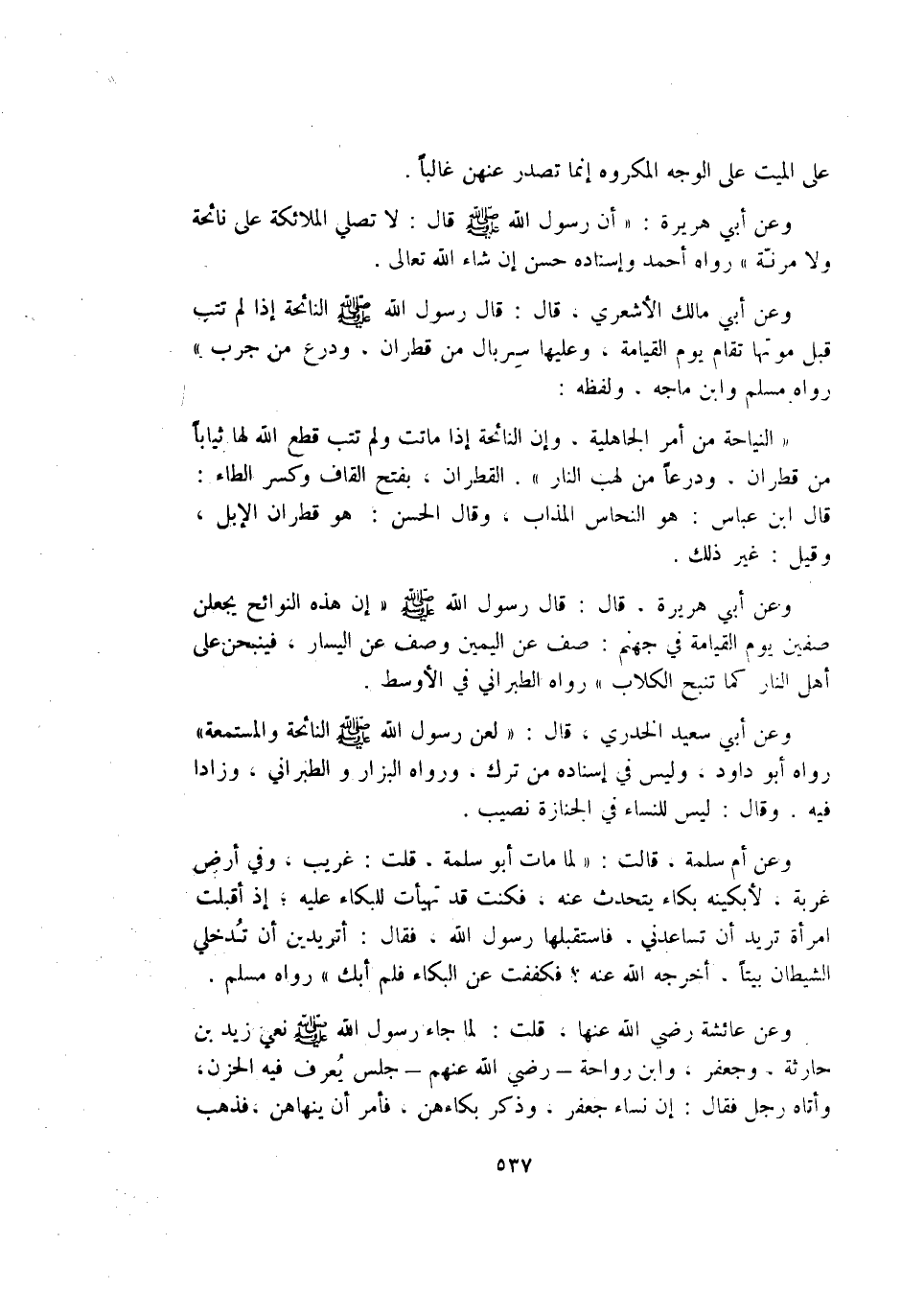 وَعَن أبي مَالك الْأَشْعَرِيّ قَالَ قَالَ رَسُول الله صلى الله عَلَيْهِ وَسلم النائحة إِذا لم تتب قبل مَوتهَا تُقَام يَوْم الْقِيَامَة وَعَلَيْهَا سربال من قطران وَدرع من جرب رَوَاهُ مُسلم وَابْن مَاجَه وَلَفظه النِّيَاحَة من أَمر الْجَاهِلِيَّة وَإِن النائحة إِذا مَاتَت وَلم تتب قطع الله لَهَا ثيابًا من قطران وَدِرْعًا من لَهب النَّار القطران بِفَتْح الْقَاف وَكسر الطَّاء قَالَ ابْن عَبَّاس هُوَ النّحاس الْمُذَاب وَقَالَ الْحسن هُوَ قطران الْإِبِل وَقيل غير ذَلِك