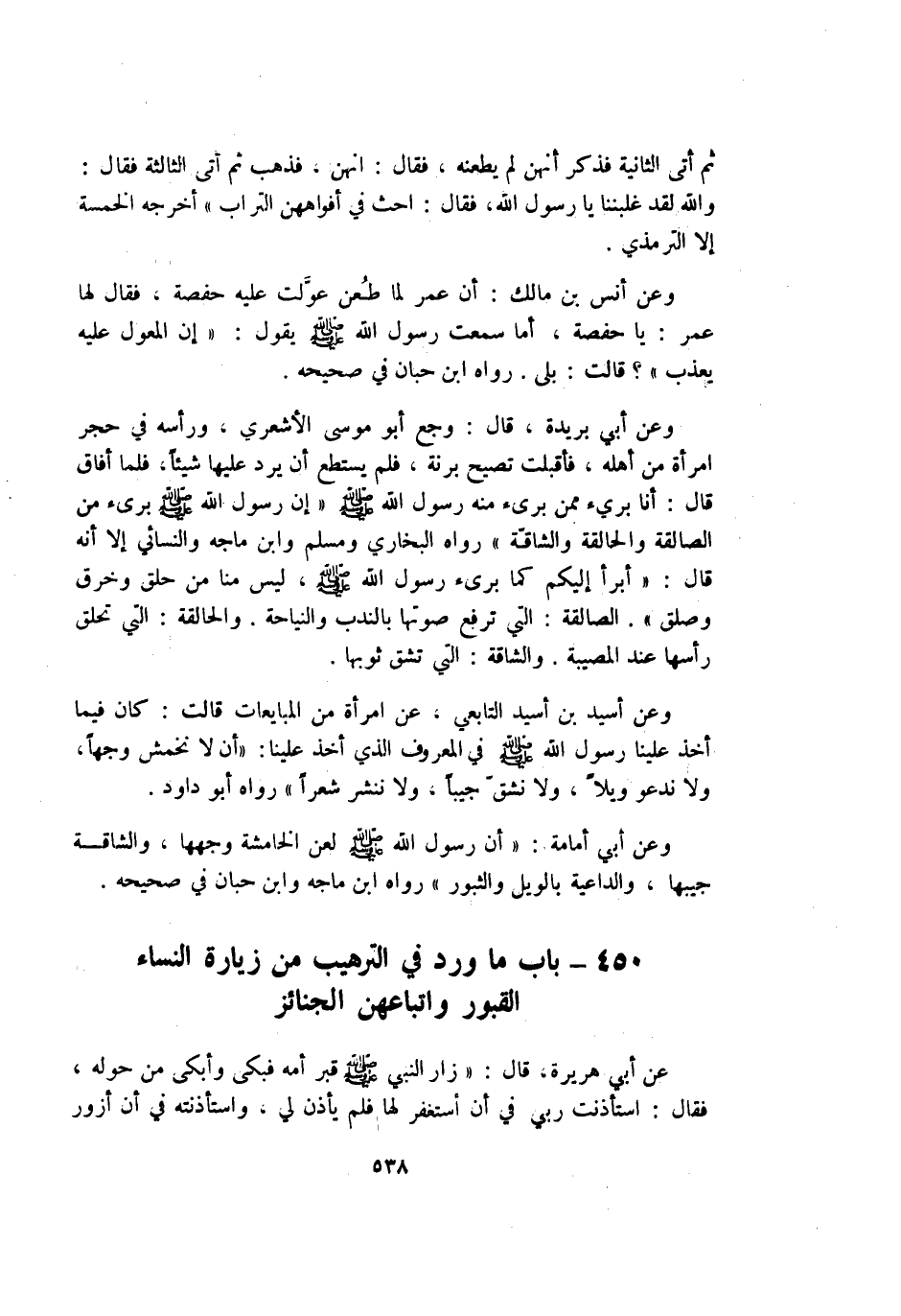450 - بَاب مَا ورد فِي التَّرْهِيب من زِيَارَة النِّسَاء الْقُبُور واتباعهن الْجَنَائِز
