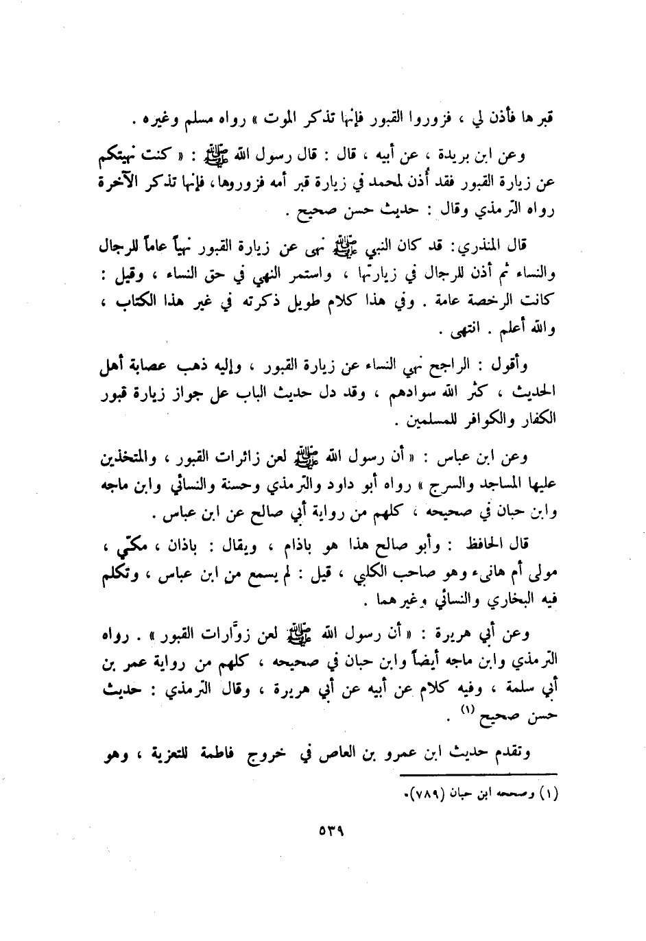 وَعَن أبي هُرَيْرَة أَن رَسُول الله صلى الله عَلَيْهِ وَسلم لعن زوارات الْقُبُور رَوَاهُ التِّرْمِذِيّ وَابْن مَاجَه أَيْضا وَابْن حبَان فِي صَحِيحه كلهم من رِوَايَة عمر بن أبي سَلمَة وَفِيه كَلَام عَن أَبِيه عَن أبي هُرَيْرَة وَقَالَ التِّرْمِذِيّ حَدِيث حسن صَحِيح