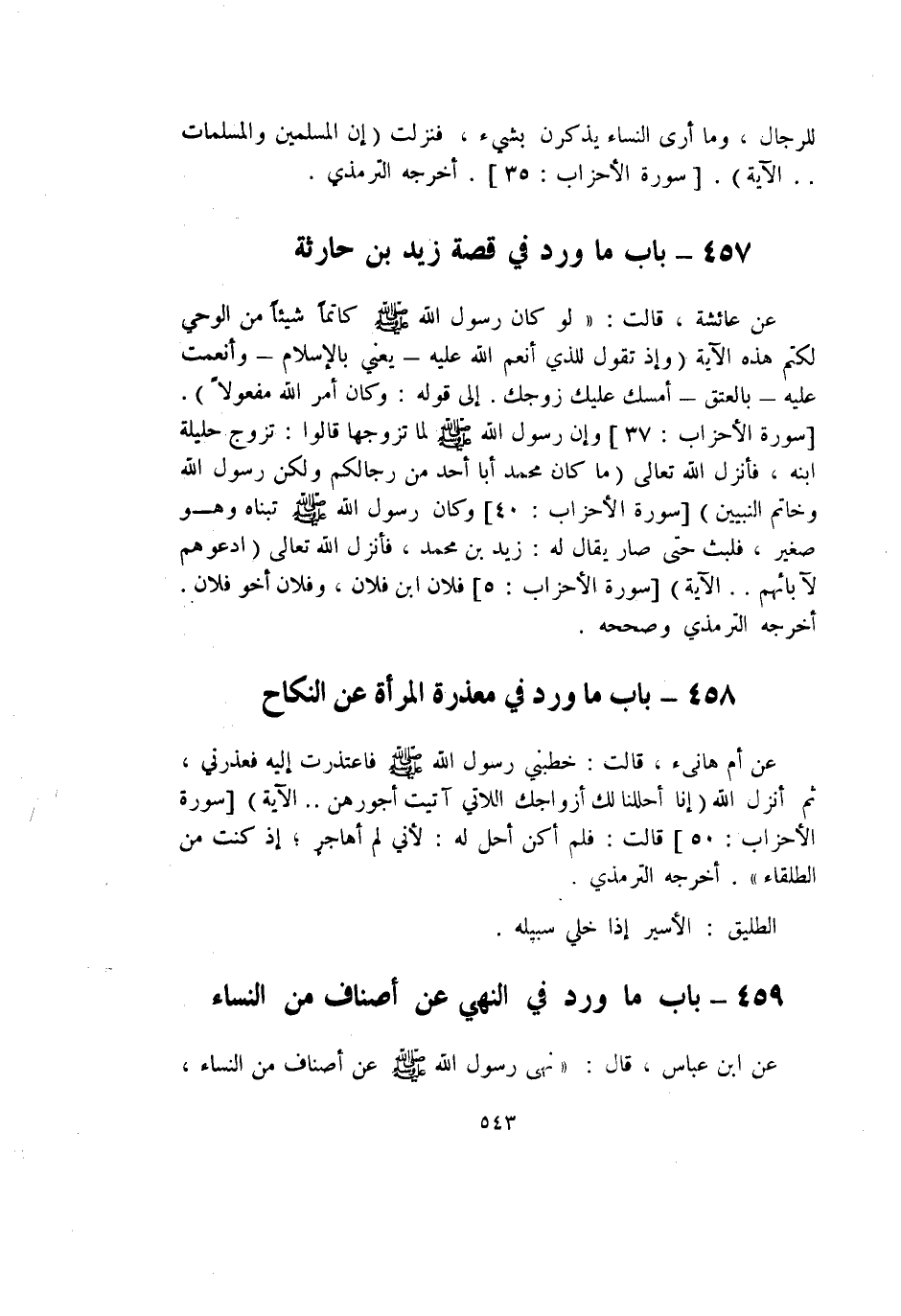 عَن عَائِشَة قَالَت لَو كَانَ رَسُول الله صلى الله عَلَيْهِ وَسلم كَاتِما شَيْئا من الْوَحْي لكَتم هَذِه الْآيَة {وَإِذ تَقول للَّذي أنعم الله عَلَيْهِ} يَعْنِي بِالْإِسْلَامِ وأنعمت عَلَيْهِ بِالْعِتْقِ أمسك عَلَيْك زَوجك) إِلَى قَوْله {وَكَانَ أَمر الله مَفْعُولا} سُورَة الْأَحْزَاب وَإِن رَسُول الله صلى الله عَلَيْهِ وَسلم لما تزَوجهَا قَالُوا تزوج حَلِيلَة ابْنه فَأنْزل الله تَعَالَى {مَا كَانَ مُحَمَّد أَبَا أحد من رجالكم وَلَكِن رَسُول الله وَخَاتم النَّبِيين} سُورَة الْأَحْزَاب وَكَانَ رَسُول الله صلى الله عَلَيْهِ وَسلم تبناه وَهُوَ صَغِير فَلبث حَتَّى صَار يُقَال لَهُ زيد بن مُحَمَّد فَأنْزل الله تَعَالَى {ادعوهُمْ لِآبَائِهِمْ} الْآيَة سُورَة الْأَحْزَاب فلَان ابْن فلَان وَفُلَان أَخُو فلَان أخرجه التِّرْمِذِيّ وَصَححهُ