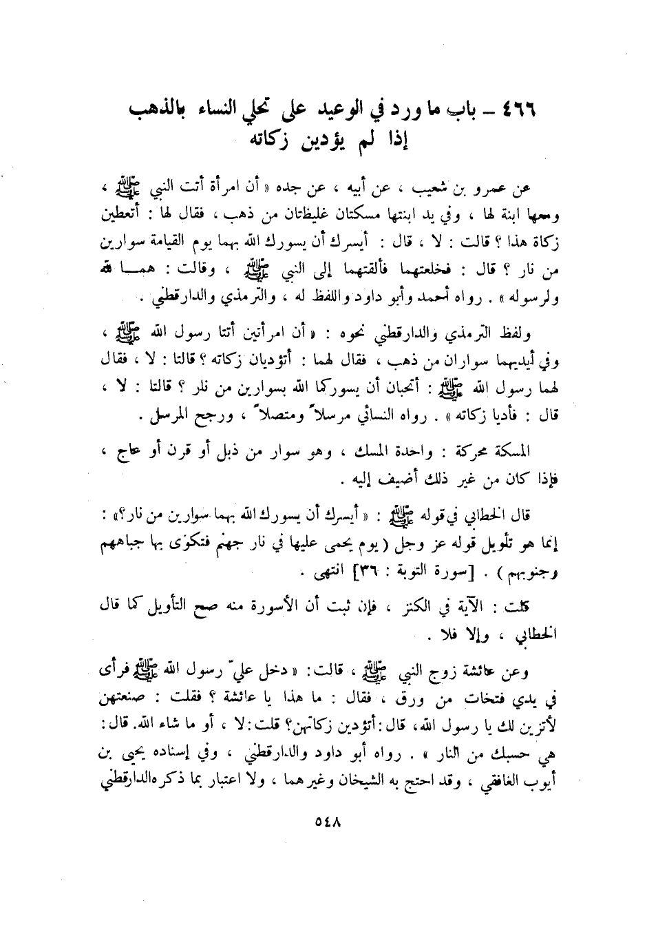 466 - بَاب مَا ورد فِي الْوَعيد على تحلي النِّسَاء بِالذَّهَب إِذا لم يؤدين زَكَاته
