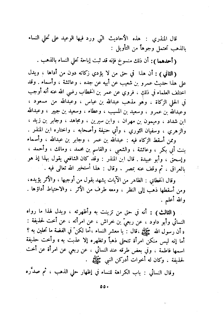 قَالَ الْمُنْذِرِيّ هَذِه الْأَحَادِيث الَّتِي ورد فِيهَا الْوَعيد على تحلي النِّسَاء بِالذَّهَب تحْتَمل وُجُوهًا من التَّأْوِيل
