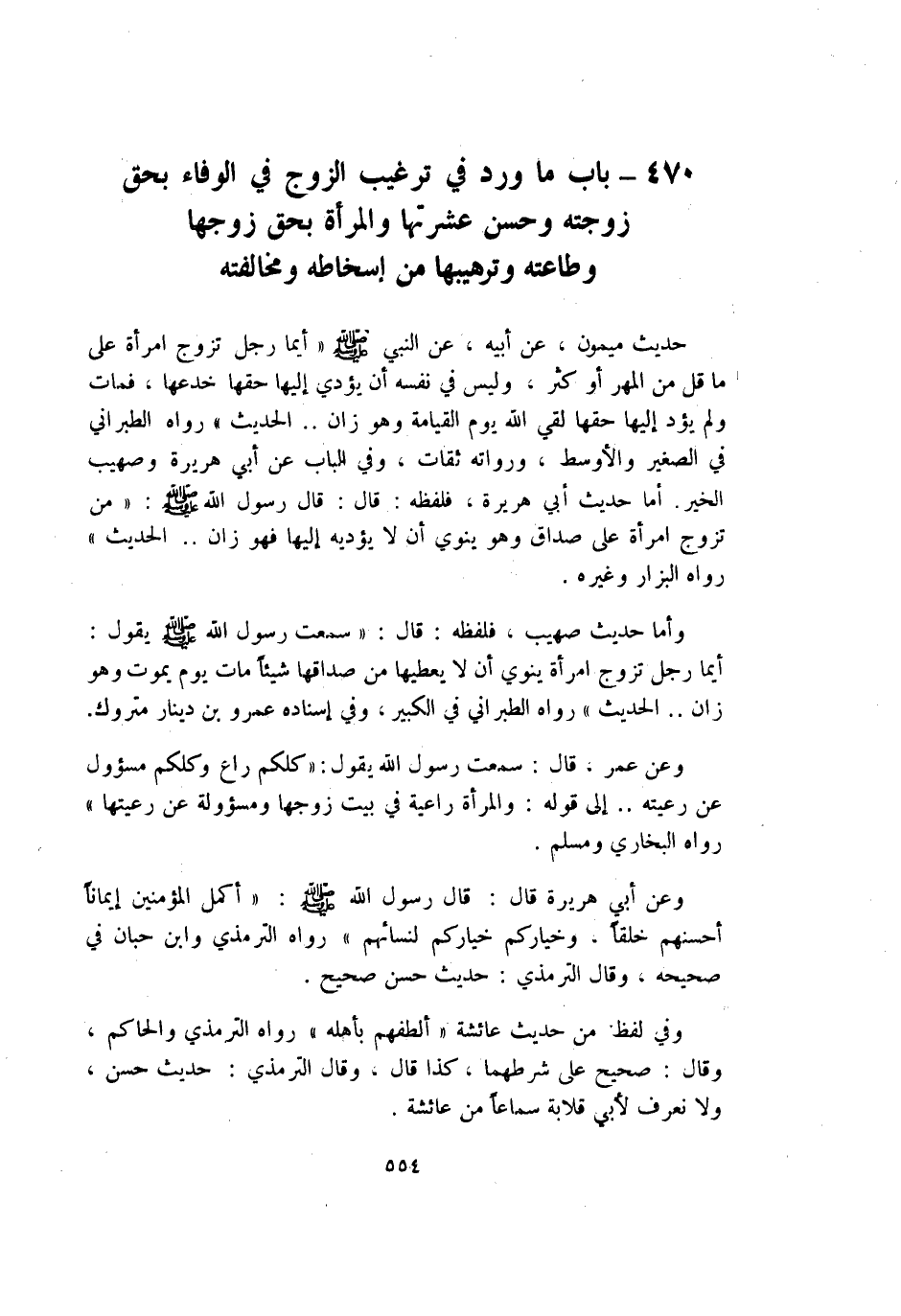 470 - بَاب مَا ورد فِي ترغيب الزَّوْج فِي الْوَفَاء بِحَق زَوجته وَحسن عشرتها وَالْمَرْأَة بِحَق زَوجهَا وطاعته وترهيبها من إسخاطه ومخالفته