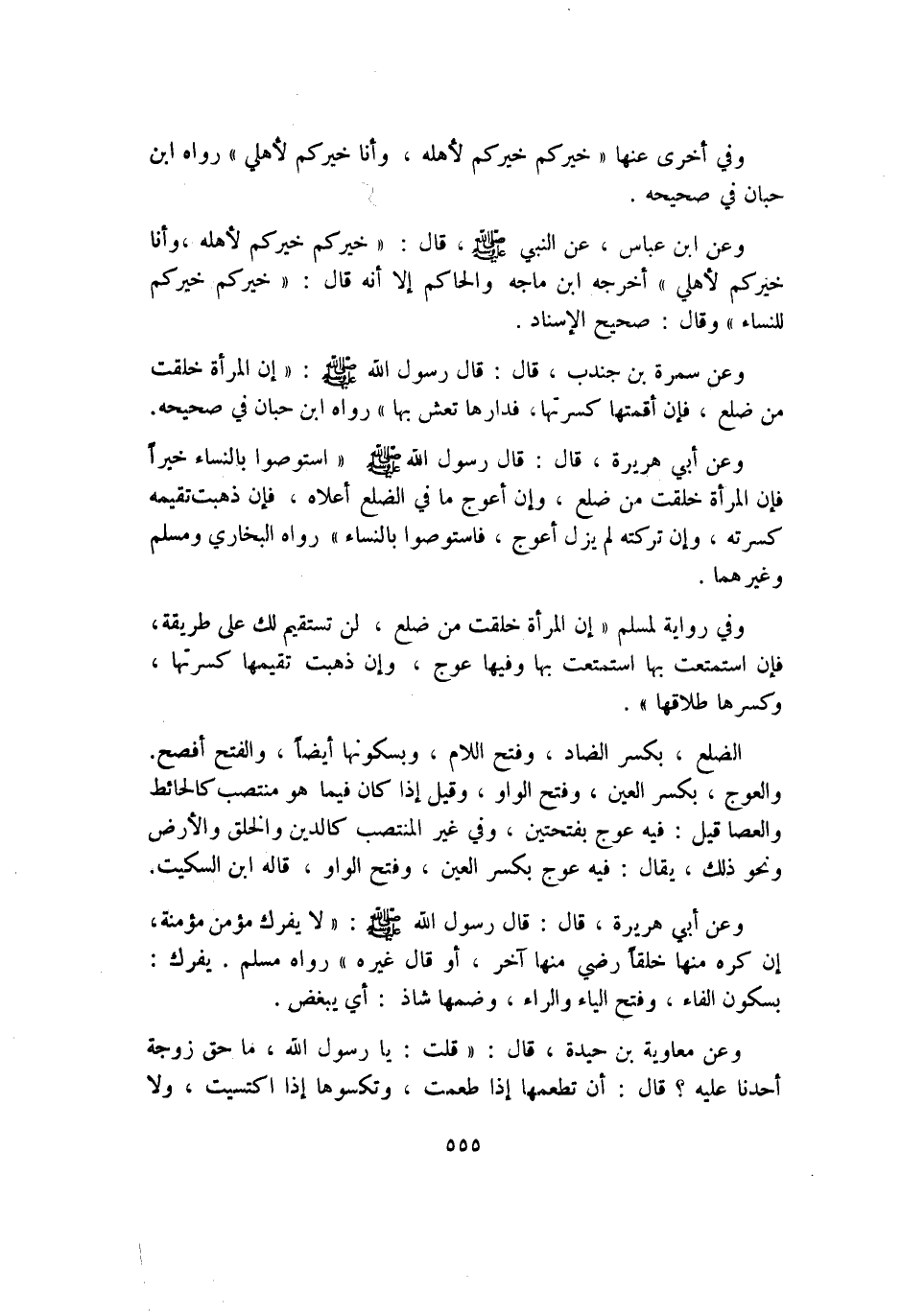وَعَن أبي هُرَيْرَة قَالَ قَالَ رَسُول الله صلى الله عَلَيْهِ وَسلم اسْتَوْصُوا بِالنسَاء خيرا فَإِن الْمَرْأَة خلقت من ضلع وَإِن أَعْوَج مَا فِي الضلع أَعْلَاهُ فَإِن ذهبت تُقِيمهُ كَسرته وَإِن تركته لم يزل أَعْوَج فَاسْتَوْصُوا بِالنسَاء رَوَاهُ البُخَارِيّ وَمُسلم وَغَيرهمَا