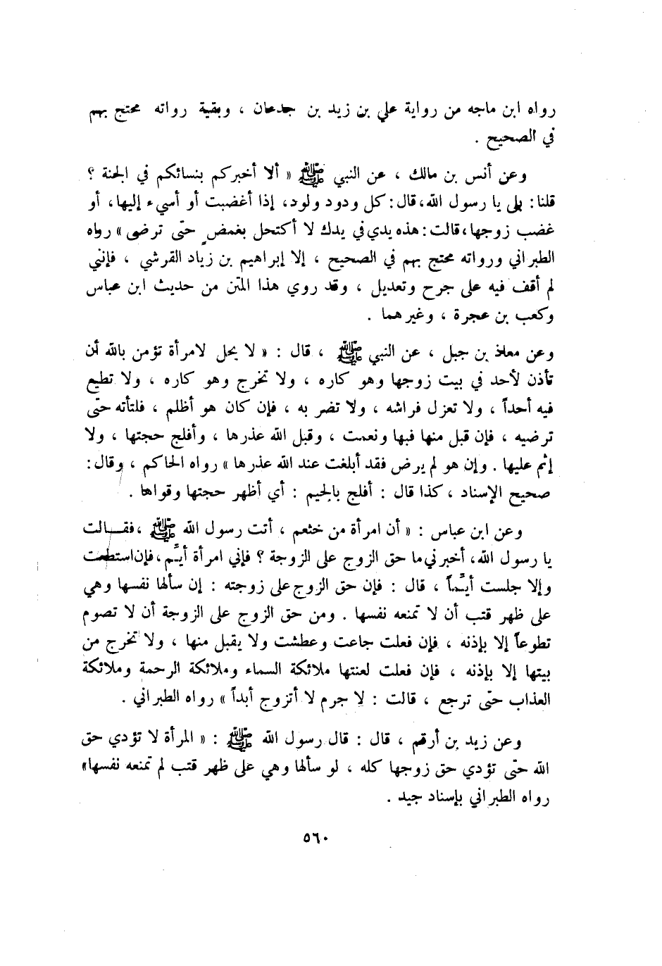 وَعَن زيد بن أَرقم قَالَ قَالَ رَسُول الله صلى الله عَلَيْهِ وَسلم الْمَرْأَة لَا تُؤدِّي حق الله حَتَّى تُؤدِّي حق زَوجهَا كُله لَو سَأَلَهَا وَهِي على ظهر قتب لم تَمنعهُ نَفسهَا رَوَاهُ الطَّبَرَانِيّ بِإِسْنَاد جيد