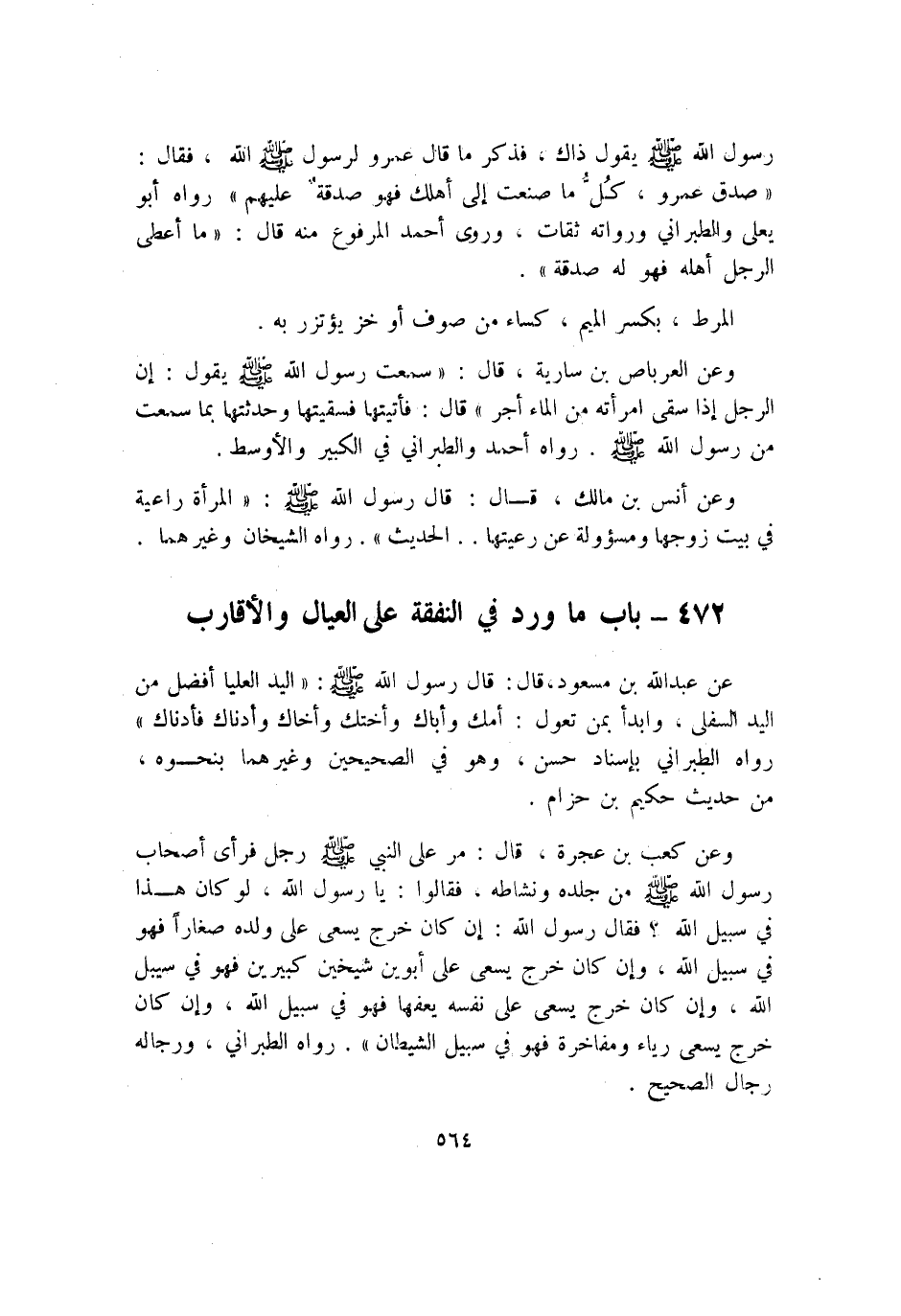 رَسُول الله صلى الله عَلَيْهِ وَسلم يَقُول ذَاك فَذكر مَا قَالَ عَمْرو لرَسُول الله صلى الله عَلَيْهِ وَسلم فَقَالَ صدق عَمْرو كل مَا صنعت إِلَى أهلك فَهُوَ صَدَقَة عَلَيْهِم رَوَاهُ أَبُو يعلى وَالطَّبَرَانِيّ وَرُوَاته ثِقَات وروى أَحْمد الْمَرْفُوع مِنْهُ قَالَ مَا أعْطى الرجل أَهله فَهُوَ لَهُ صدقه