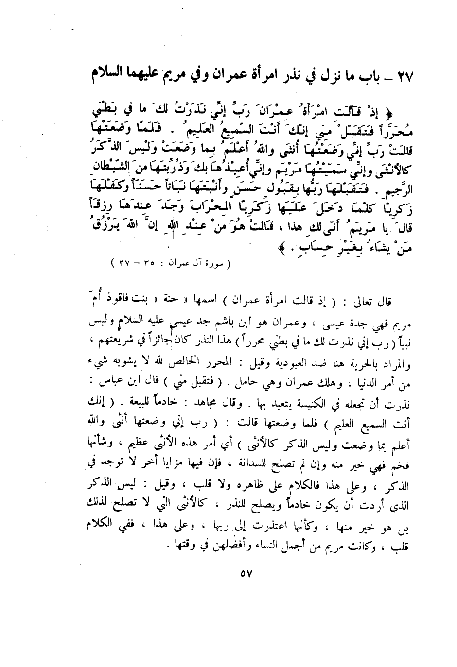 قَالَ تَعَالَى {إِذْ قَالَت امْرَأَة عمرَان} اسْمهَا حنة بنت فاقوذ أم مَرْيَم فَهِيَ جدة عِيسَى وَعمْرَان هُوَ ابْن باشم جد عِيسَى عَلَيْهِ السَّلَام وَلَيْسَ نَبيا {رب إِنِّي نذرت لَك مَا فِي بَطْني محررا} هَذَا النّذر كَانَ جَائِزا فِي شريعتهم وَالْمرَاد بِالْحُرِّيَّةِ هُنَا ضد الْعُبُودِيَّة وَقيل الْمُحَرر الْخَالِص لله لَا يشوبه شَيْء من أَمر الدُّنْيَا وَهلك عمرَان وَهِي حَامِل {فَتقبل مني} قَالَ ابْن عَبَّاس نذرت أَن تَجْعَلهُ فِي الْكَنِيسَة يتعبد بهَا وَقَالَ مُجَاهِد خَادِمًا لِلْبيعَةِ {إِنَّك أَنْت السَّمِيع الْعَلِيم} فَلَمَّا وَضَعتهَا قَالَت {رب إِنِّي وَضَعتهَا أُنْثَى وَالله أعلم بِمَا وضعت وَلَيْسَ الذّكر كالأنثى} أَي أَمر هَذِه الْأُنْثَى عَظِيم وشأنها فخم فَهِيَ خير مِنْهُ وَإِن لم تصلح للسدانة فَإِن فِيهَا مزايا أخر لَا تُوجد فِي الذّكر وعَلى هَذَا فَالْكَلَام على ظَاهره وَلَا قلب وَقيل لَيْسَ الذّكر الَّذِي أردْت أَن يكون خَادِمًا وَيصْلح للنذر كالأنثى الَّتِي لَا تصلح لذَلِك بل هُوَ خير مِنْهَا وَكَأَنَّهَا اعتذرت إِلَى رَبهَا وعَلى هَذَا فَفِي الْكَلَام قلب وَكَانَت مَرْيَم من اجمل النِّسَاء وأفضلهن فِي وَقتهَا