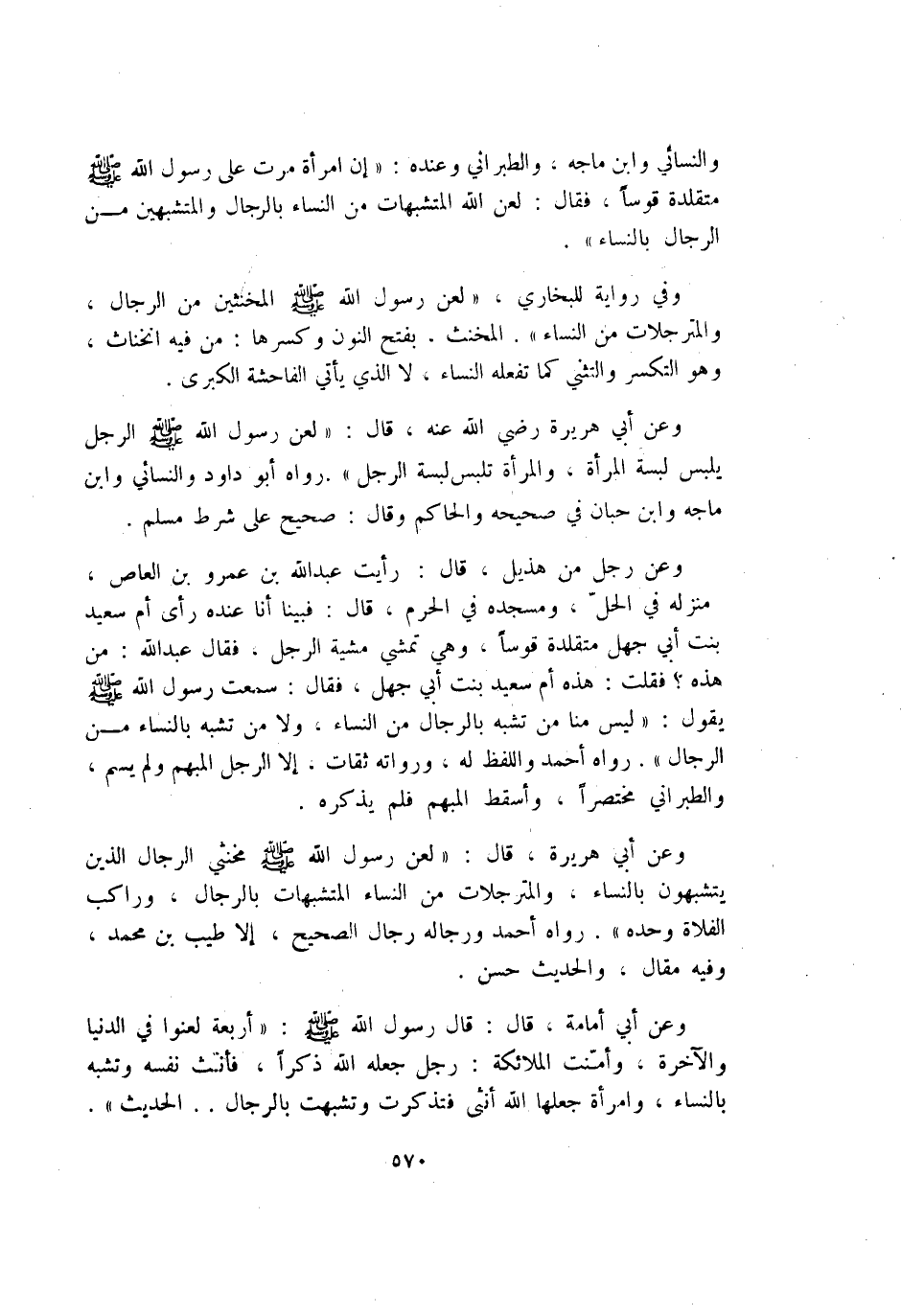 وَعَن رجل من هُذَيْل قَالَ رَأَيْت عبد الله بن عَمْرو بن الْعَاصِ منزله فِي الْحل ومسجده فِي الْحرم قَالَ فَبينا أَنا عِنْده رأى أم سعيد بنت أبي جهل متقلدة قوسا وَهِي تمشي مشْيَة الرجل فَقَالَ عبد الله من هَذِه فَقلت هَذِه أم سعيد بنت أبي جهل فَقَالَ سَمِعت رَسُول الله صلى الله عَلَيْهِ وَسلم يَقُول لَيْسَ منا من تشبه بِالرِّجَالِ من النِّسَاء وَلَا من تشبه بِالنسَاء من الرِّجَال رَوَاهُ أَحْمد وَاللَّفْظ لَهُ وَرُوَاته ثِقَات إِلَّا الرجل الْمُبْهم وَلم يسم وَالطَّبَرَانِيّ مُخْتَصرا وَأسْقط الْمُبْهم فَلم يذكرهُ