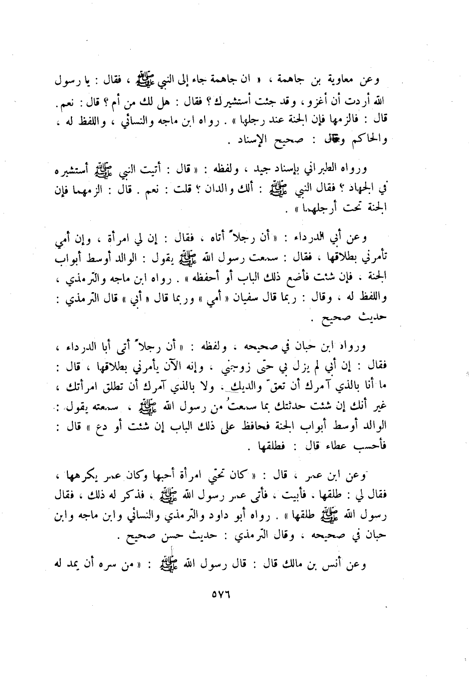 وَعَن مُعَاوِيَة بن جاهمة ان جاهمة جَاءَ إِلَى النَّبِي صلى الله عَلَيْهِ وَسلم فَقَالَ يَا رَسُول الله أردْت أَن أغزو وَقد جِئْت أستشيرك فَقَالَ هَل لَك من أم قَالَ نعم قَالَ فالزمها فَإِن الْجنَّة عِنْد رجلهَا رَوَاهُ ابْن مَاجَه وَالنَّسَائِيّ وَاللَّفْظ لَهُ وَالْحَاكِم وَقَالَ صَحِيح الْإِسْنَاد