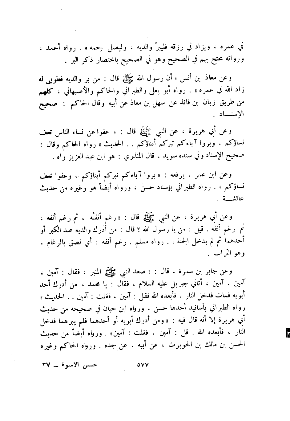 وَعَن جَابر بن سَمُرَة قَالَ صعد النَّبِي صلى الله عَلَيْهِ وَسلم الْمِنْبَر فَقَالَ آمين آمين آمين أَتَانِي جِبْرِيل عَلَيْهِ السَّلَام فَقَالَ يَا مُحَمَّد من أدْرك أحد أَبَوَيْهِ فَمَاتَ فَدخل النَّار فَأَبْعَده الله فَقل آمين فَقلت آمين الحَدِيث رَوَاهُ الطَّبَرَانِيّ بأسانيد أَحدهَا حسن وَرَوَاهُ ابْن حبَان فِي صَحِيحه من حَدِيث أبي هُرَيْرَة إِلَّا أَنه قَالَ فِيهِ وَمن أدْرك أَبَوَيْهِ أَو أَحدهمَا فَلم يَبرهُمَا فَدخل النَّار فَأَبْعَده الله قل آمين فَقلت آمين وَرَوَاهُ أَيْضا من حَدِيث الْحسن بن مَالك بن الْحُوَيْرِث عَن أَبِيه عَن جده وَرَوَاهُ الْحَاكِم وَغَيره