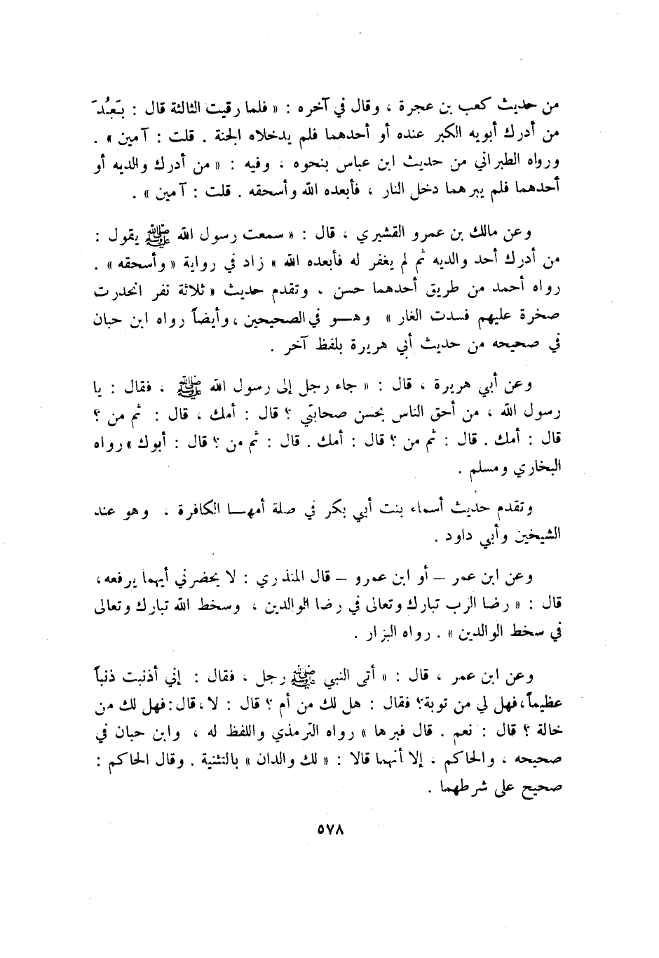 وَعَن مَالك بن عَمْرو الْقشيرِي قَالَ سَمِعت رَسُول الله صلى الله عَلَيْهِ وَسلم يَقُول من أدْرك أحد وَالِديهِ ثمَّ لم يغْفر لَهُ فَأَبْعَده الله زَاد فِي رِوَايَة وأسحقه رَوَاهُ أَحْمد من طَرِيق أَحدهمَا حسن وَتقدم حَدِيث ثَلَاثَة نفر انحدرت صَخْرَة عَلَيْهِم فَسدتْ الْغَار وَهُوَ فِي الصَّحِيحَيْنِ وَأَيْضًا رَوَاهُ ابْن حبَان فِي صَحِيحه من حَدِيث أبي هُرَيْرَة بِلَفْظ آخر