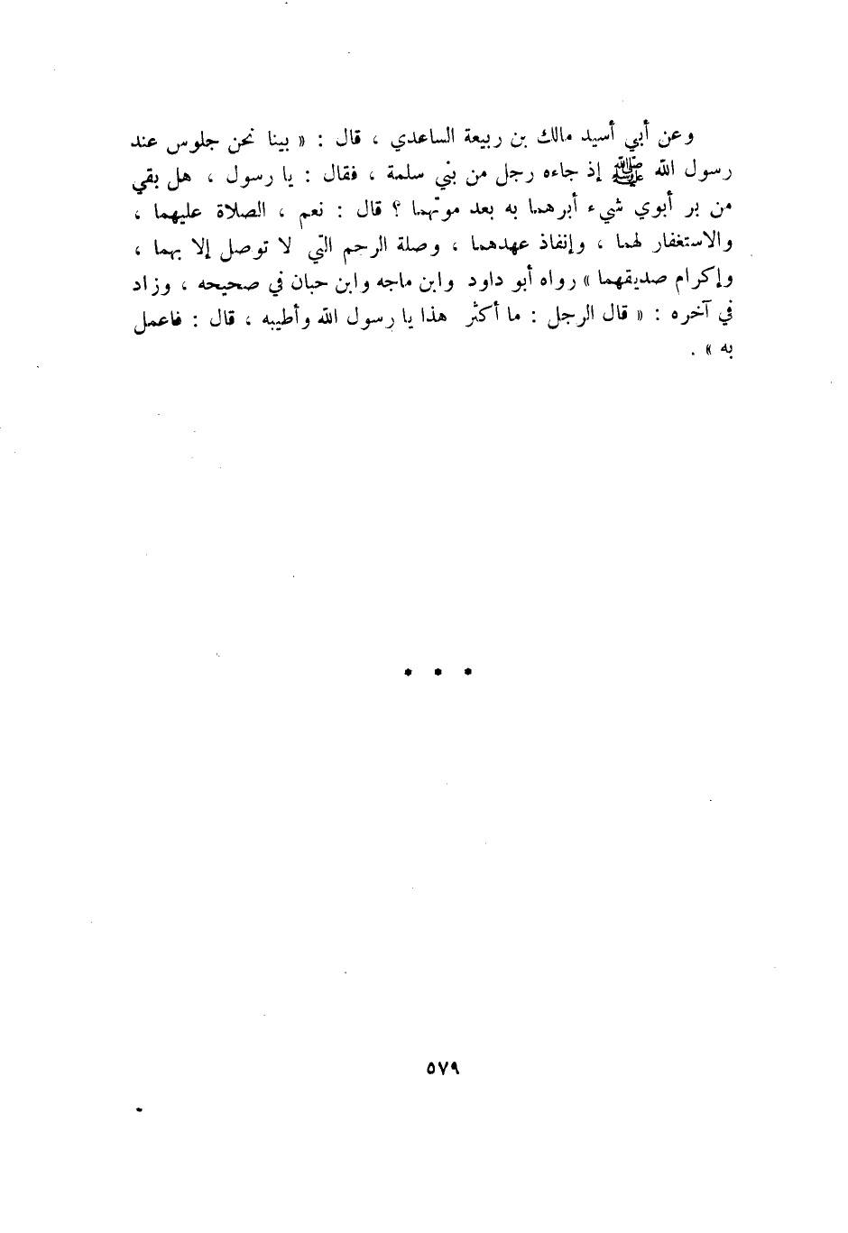 وَعَن أبي أسيد مَالك بن ربيعَة السَّاعِدِيّ قَالَ بَيْنَمَا نَحن جُلُوس عِنْد رَسُول الله صلى الله عَلَيْهِ وَسلم إِذْ جَاءَهُ رجل من بني سَلمَة فَقَالَ يَا رَسُول هَل بَقِي من بر أَبَوي شَيْء أبرهما بِهِ بعد مَوْتهمَا قَالَ نعم الصَّلَاة عَلَيْهِمَا والأستغفار لَهما وإنفاذ عهدهما وصلَة الرَّحِم الَّتِي لَا توصل إِلَّا بهما وإكرام صديقهما رَوَاهُ أَبُو دَاوُد وَابْن مَاجَه وَابْن حبَان فِي صَحِيحه وَزَاد فِي آخِره قَالَ الرجل مَا أَكثر هَذَا يَا رَسُول الله وأطيبه قَالَ فاعمل بِهِ