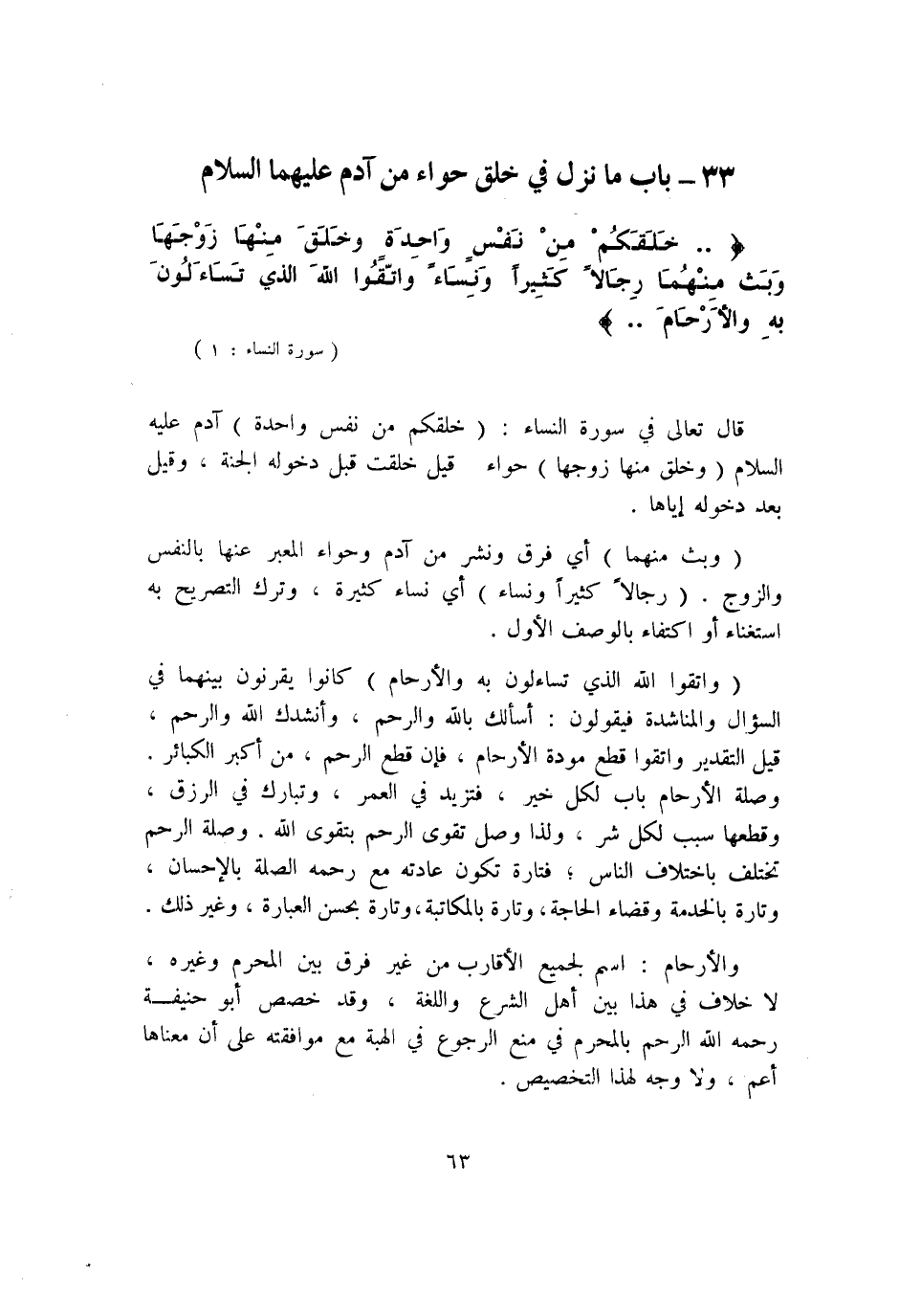 قَالَ تَعَالَى فِي سُورَة السناء {خَلقكُم من نفس وَاحِدَة} آدم عَلَيْهِ السَّلَام {وَخلق مِنْهَا زَوجهَا} حَوَّاء قيل خلقت قبل دُخُوله الْجنَّة وَقيل بعد دُخُوله إِيَّاهَا {وَبث مِنْهُمَا} أَي فرق وَنشر من آدم وحواء الْمعبر عَنْهَا بِالنَّفسِ وَالزَّوْج {رجَالًا كثيرا وَنسَاء} أَي نسَاء كَثِيرَة وَترك التَّصْرِيح بِهِ اسْتغْنَاء أَو اكْتِفَاء بِالْوَصْفِ الأول {وَاتَّقوا الله الَّذِي تساءلون بِهِ والأرحام} كَانُوا يقرنون بَينهمَا فِي السُّؤَال والمناشدة فَيَقُولُونَ أَسأَلك بِاللَّه وَالرحم وأنشدك الله وَالرحم قيل التَّقْدِير وَاتَّقوا قطع مَوَدَّة الْأَرْحَام فَإِن قطع الرَّحِم من أكبر الْكَبَائِر وصلَة الْأَرْحَام بَاب لكل خير فتزيد فِي الْعُمر وتبارك فِي الرزق وقطعها سَبَب لكل شَرّ وَلذَا وصل تقوى الرَّحِم بتقوى الله وصلَة الرَّحِم تخْتَلف باخْتلَاف النَّاس فَتَارَة تكون عَادَته مَعَ رَحمَه الصِّلَة بِالْإِحْسَانِ وَتارَة بِالْخدمَةِ وَقَضَاء الْحَاجة وَتارَة بالمكاتبة وَتارَة بِحسن الْعبارَة وَغير ذَلِك