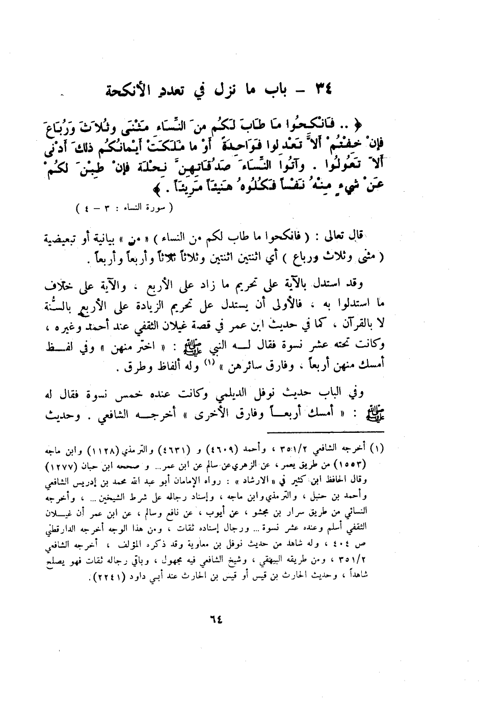 {فانكحوا مَا طَابَ لكم من النِّسَاء مثنى وَثَلَاث وَربَاع فَإِن خِفْتُمْ أَلا تعدلوا فَوَاحِدَة أَو مَا ملكت أَيْمَانكُم ذَلِك أدنى أَلا تعولُوا وَآتوا النِّسَاء صدقاتهن نحلة فَإِن طبن لكم عَن شَيْء مِنْهُ نفسا فكلوه هَنِيئًا مريئا} قَالَ تَعَالَى {فانكحوا مَا طَابَ لكم من النِّسَاء} من بَيَانِيَّة أَو تبعيضية {مثنى وَثَلَاث وَربَاع} أَي اثْنَتَيْنِ اثْنَتَيْنِ وَثَلَاثًا ثَلَاثًا وأربعا وأربعا وَقد اسْتدلَّ بِالْآيَةِ على تَحْرِيم مَا زَاد على الْأَرْبَع وَالْآيَة على خلاف مَا استدلوا بِهِ فَالْأولى أَن يسْتَدلّ على تَحْرِيم الزِّيَادَة على الْأَرْبَع بِالسنةِ لَا بِالْقُرْآنِ كَمَا فِي حَدِيث ابْن عمر فِي قصَّة غيلَان الثَّقَفِيّ عِنْد أَحْمد وَغَيره وَكَانَت تَحْتَهُ عشر نسْوَة فَقَالَ لَهُ النَّبِي صلى الله عَلَيْهِ وَسلم اختر مِنْهُنَّ وَفِي لفظ أمسك مِنْهُنَّ أَرْبعا وَفَارق سائرهن وَله أَلْفَاظ وطرق