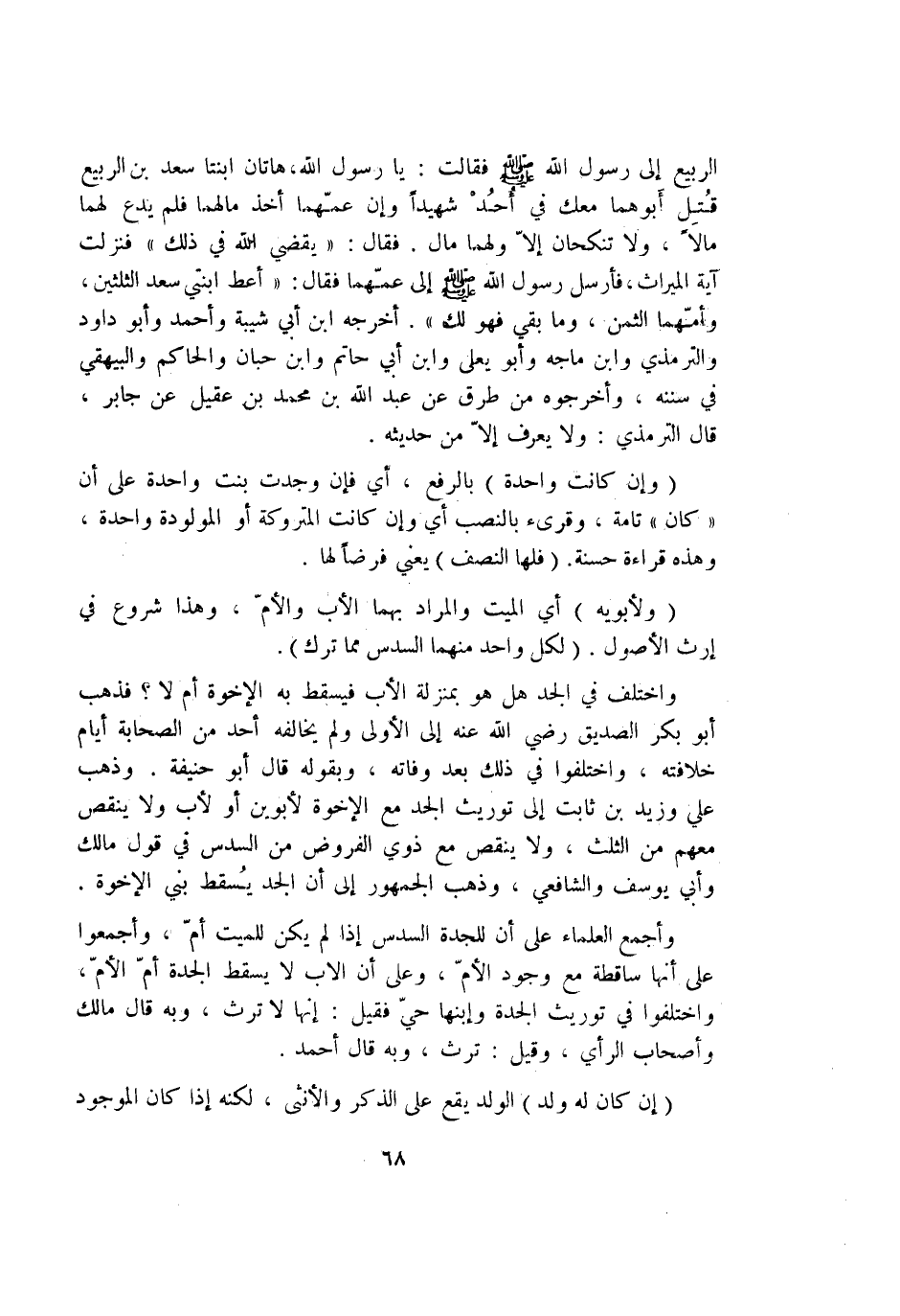 الرّبيع إِلَى رَسُول الله صلى الله عَلَيْهِ وَسلم فَقَالَت يَا رَسُول الله هَاتَانِ ابنتا سعد بن الرّبيع قتل أَبوهُمَا مَعَك فِي أحد شَهِيدا وَإِن عَمهمَا أَخذ مَالهمَا فَلم يدع لَهما مَالا وَلَا تنكحان إِلَّا وَلَهُمَا مَال فَقَالَ يقْضِي الله فِي ذَلِك فَنزلت آيَة الْمِيرَاث فَأرْسل رَسُول الله صلى الله عَلَيْهِ وَسلم إِلَى عَمهمَا فَقَالَ أعْط ابْنَتي سعد الثُّلثَيْنِ وأمهما الثّمن وَمَا بَقِي فَهُوَ لَك أخرجه ابْن أبي شيبَة وَأحمد وَأَبُو دَاوُد وَالتِّرْمِذِيّ وَابْن مَاجَه وَأَبُو يعلي وَابْن أبي حَاتِم وَابْن حبَان وَالْحَاكِم وَالْبَيْهَقِيّ فِي سنَنه وأخرجوه من طرق عَن عبد الله بن مُحَمَّد بن عقيل عَن جَابر قَالَ التِّرْمِذِيّ وَلَا يعرف إِلَّا من حَدِيثه