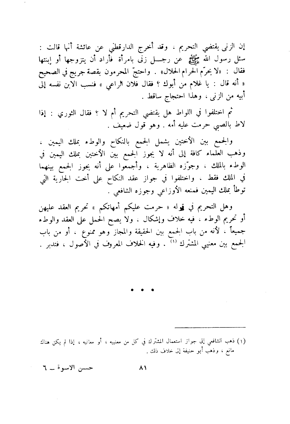 وَهل التَّحْرِيم فِي قَوْله {حرمت عَلَيْكُم أُمَّهَاتكُم} تَحْرِيم العقد عَلَيْهِنَّ أَو تَحْرِيم الْوَطْء فِيهِ خلاف وإشكال وَلَا يَصح الْحمل على العقد وَالْوَطْء جَمِيعًا لِأَنَّهُ من بَاب الْجمع بَين الْحَقِيقَة وَالْمجَاز وَهُوَ مَمْنُوع أَو من بَاب الْجمع بَين معنيي الْمُشْتَرك وَفِيه الْخلاف الْمَعْرُوف فِي الْأُصُول فَتدبر