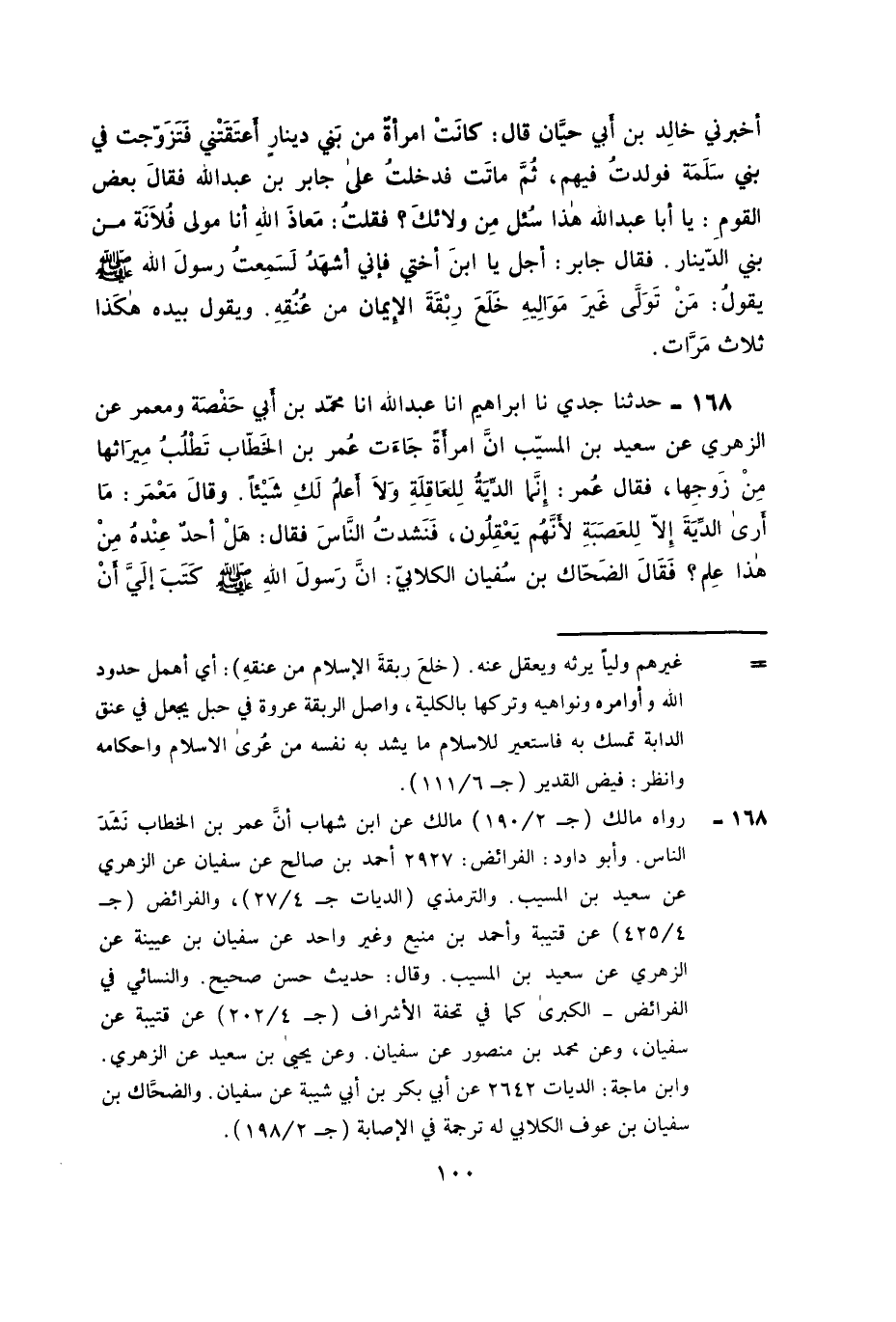 ١٦٨ - حَدَّثَنَا جَدِّي، نَا إِبْرَاهِيمُ، أَنا عَبْدُ اللَّهِ أَنا مُحَمَّدُ بْنُ أَبِي حَفْصَةَ , وَمَعْمَرٌ , عَنِ الزُّهْرِيِّ , عَنْ سَعِيدِ بْنِ الْمُسَيِّبِ , أَنَّ امْرَأَةً جَاءَتْ عُمَرَ بْنَ الْخَطَّابِ تَطْلُبُ مِيرَاثَهَا مِنْ زَوْجِهَا , فَقَالَ عُمَرُ: إِنَّمَا الدِّيَةُ لِلْعَاقِلَةِ وَلَا أَعْلَمُ لَكِ شَيْئًا. وَقَالَ مَعْمَرٌ: مَا أَرَى الدِّيَةَ إِلَّا لِلْعَصَبَةِ لِأَنَّهُمْ يَعْقِلُونَ , فَنَشَدْتُ النَّاسَ , فَقَالَ: هَلْ أَحَدٌ عِنْدَهُ مِنْ هَذَا عِلْمٌ؟ فَقَالَ الضَّحَّاكُ بْنُ سُفْيَانَ الْكِلَابِيُّ: «إِنَّ رَسُولَ اللَّهِ صَلَّى اللَّهُ عَلَيْهِ وَسَلَّمَ كَتَبَ إِلَيَّ أَنْ ⦗١٠١⦘ أُوَرِّثَ امْرَأَةَ أَشْيَمَ الضَّبَابِيِّ مِنْ دِيَةِ زَوْجِهَا , فَوَرَّثَهَا عُمَرُ»