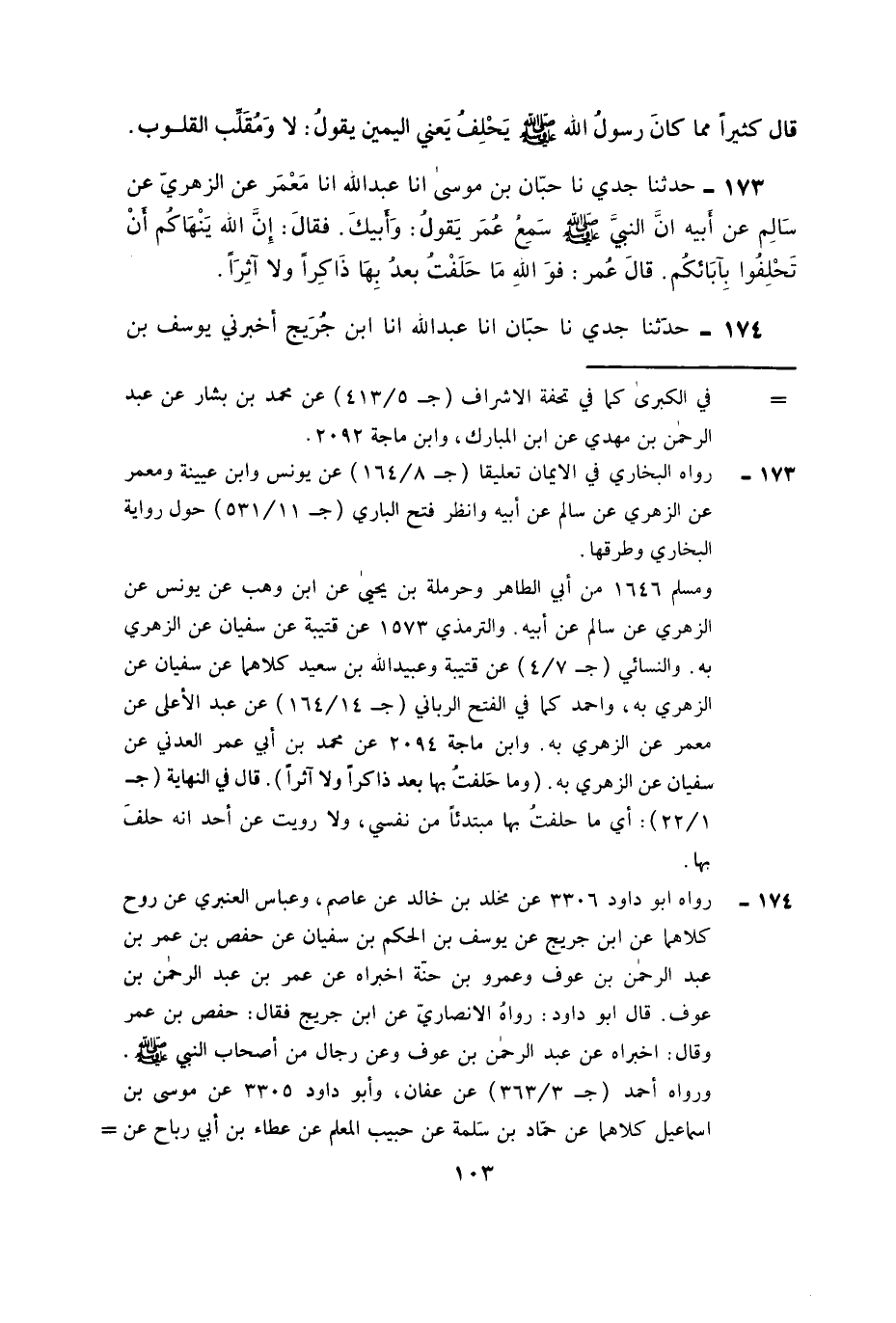 ١٧٣ - حَدَّثَنَا جَدِّي، نَا حَبَّانُ بْنُ مُوسَى، أَنا عَبْدُ اللَّهِ، أَنا مَعْمَرٌ , عَنِ الزُّهْرِيِّ , عَنْ سَالِمٍ , عَنْ أَبِيهِ , أَنَّ النَّبِيَّ صَلَّى اللَّهُ عَلَيْهِ وَسَلَّمَ سَمِعَ عُمَرَ يَقُولُ: وأَبِيكَ. فَقَالَ: «إِنَّ اللَّهَ يَنْهَاكُمْ أَنْ تَحْلِفُوا بِآبَائِكُمْ» . قَالَ عُمَرُ: فَوَاللَّهِ مَا حَلَفْتُ بَعْدُ بِهَا ذَاكِرًا وَلَا آثِرًا