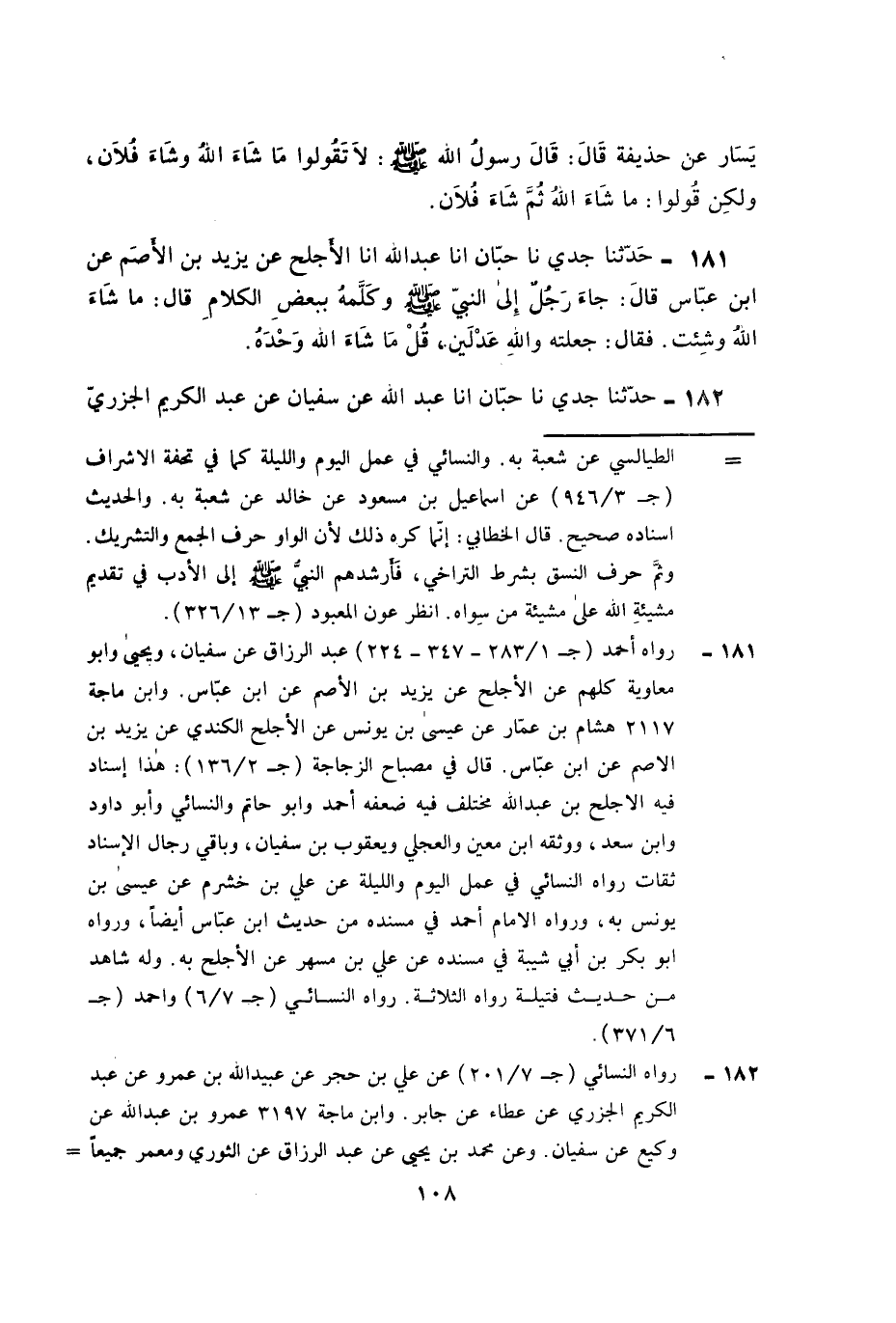 ١٨١ - حَدَّثَنَا جَدِّي، نَا حَبَّانُ، أَنا عَبْدُ اللَّهِ، أَنا الْأَجْلَحُ , عَنْ يَزِيدَ بْنِ الْأَصَمِّ , عَنِ ابْنِ عَبَّاسٍ , قَالَ: جَاءَ رَجُلٌ إِلَى النَّبِيِّ صَلَّى اللَّهُ عَلَيْهِ وَسَلَّمَ وَكَلَّمَهُ بِبَعْضِ الْكَلَامِ , قَالَ: مَا شَاءَ اللَّهُ وَشِئْتَ , فَقَالَ: «جَعَلْتَهُ وَاللَّهِ عَدْلَيْنِ , قُلْ: مَا شَاءَ اللَّهُ وَحْدَهُ»