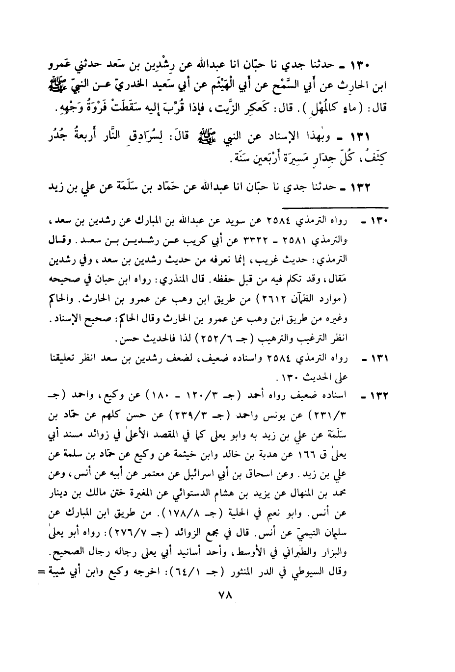 ١٣٠ - حَدَّثَنَا جَدِّي، نَا حِبَّانُ، أَنا عَبْدُ اللَّهِ عَنْ رِشْدِينَ بْنِ سَعْدٍ , حَدَّثَنِي عَمْرُو بْنُ الْحَارِثِ , عَنْ أَبِي السَّمْحِ , عَنْ أَبِي الْهَيْثَمِ , عَنْ أَبِي سَعِيدٍ الْخُدْرِيِّ , عَنِ النَّبِيِّ صَلَّى اللَّهُ عَلَيْهِ وَسَلَّمَ , قَالَ: مَاءٌ كَالْمُهْلِ , قَالَ: «كَعَكَرِ الزَّيْتِ , فَإِذَا قُرِّبَ إِلَيْهِ سَقَطَتْ فَرْوَةُ وَجْهِهِ»