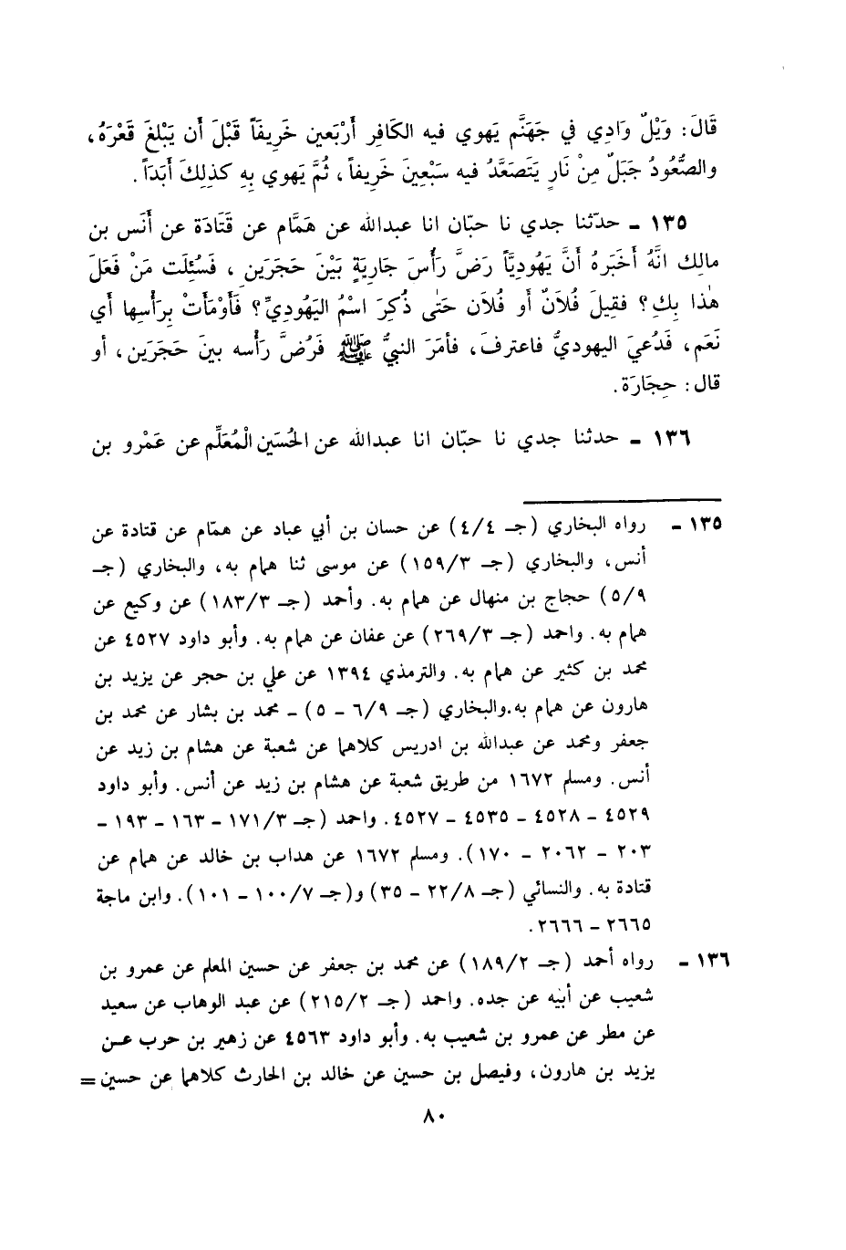 ١٣٥ - حَدَّثَنَا جَدِّي، نَا حِبَّانُ، أَنا عَبْدُ اللَّهِ عَنْ هَمَّامٍ , عَنْ قَتَادَةَ , عَنْ أَنَسِ بْنِ مَالِكٍ أَنَّهُ أَخْبَرَهُ أَنَّ يَهُودِيًّا رَضَّ رَأْسَ جَارِيَةٍ بَيْنَ حَجَرَيْنِ , فَسُئِلَتْ: مَنْ فَعَلَ هَذَا بِكِ؟ فَقِيلَ: فُلَانٌ , أَوْ فُلَانٌ حَتَّى ذُكِرَ اسْمُ الْيَهُودِيِّ , فَأَوْمَأَتْ بِرَأْسِهَا، أَيْ: نَعَمْ , فَدُعِيَ الْيَهُودِيُّ فَاعْتَرَفَ , «فَأَمَرَ النَّبِيُّ صَلَّى اللَّهُ عَلَيْهِ وَسَلَّمَ فَرُضَّ رَأْسُهُ بَيْنَ حَجَرَيْنِ» , أَوْ قَالَ: حِجَارَةٍ