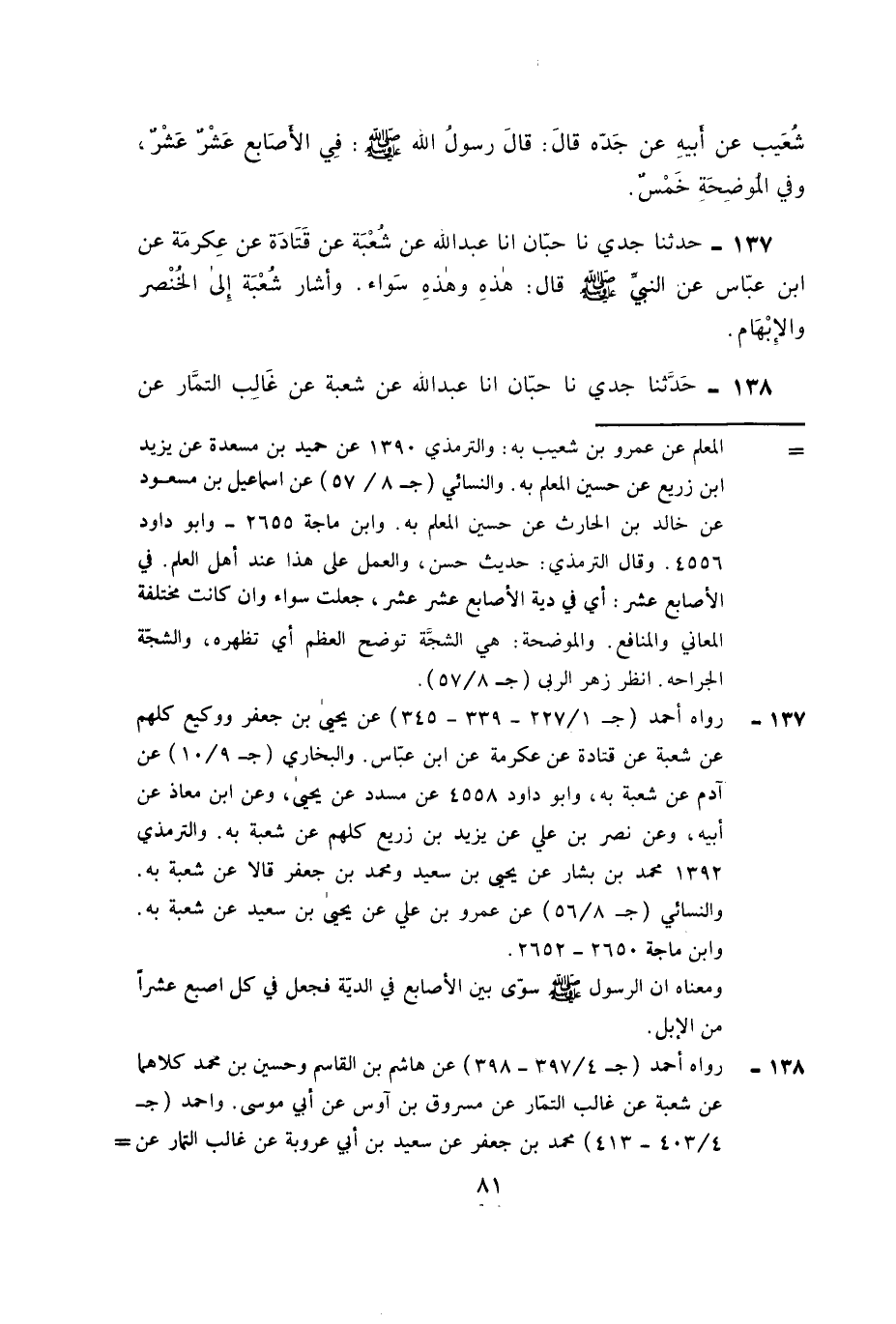 ١٣٨ - حَدَّثَنَا جَدِّي، نَا حِبَّانُ، أَنا عَبْدُ اللَّهِ عَنْ شُعْبَةَ , عَنْ غَالِبٍ التَّمَّارِ , عَنْ ⦗٨٢⦘ مَسْرُوقِ بْنِ أَوْسٍ وَكَانَ آخِذَ الدِّرْهَمَيْنِ عَلَى عَهْدِ عُمَرَ , عَنْ أَبِي مُوسَى الْأَشْعَرِيِّ , عَنِ النَّبِيِّ صَلَّى اللَّهُ عَلَيْهِ وَسَلَّمَ , قَالَ: «الْأَصَابِعُ سَوَاءٌ» , قُلْتُ لِغَالِبٍ التَّمَّارِ: فِي كُلِّ وَاحِدٍ عَشْرٌ؟ قَالَ: نَعَمْ