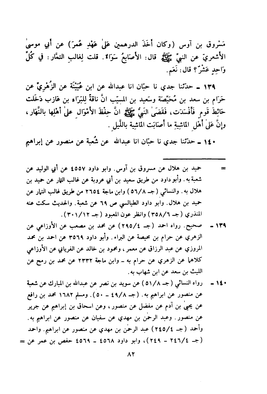 ١٣٩ - حَدَّثَنَا جَدِّي، نَا حِبَّانُ، أَنا عَبْدُ اللَّهِ عَنِ ابْنِ عُيَيْنَةَ , عَنِ الزُّهْرِيِّ , عَنْ حَرَامِ بْنِ سَعْدِ بْنِ مُحَيِّصَةَ , وَسَعِيدِ بْنِ الْمُسَيِّبِ , أَنَّ نَاقَةً لِلْبَرَاءِ بْنِ عَازِبٍ دَخَلَتْ حَائِطَ قَوْمٍ فَأَفْسَدَتْ , فَقَضَى النَّبِيُّ صَلَّى اللَّهُ عَلَيْهِ وَسَلَّمَ: «إِنَّ حِفْظَ الْأَمْوَالِ عَلَى أَهْلِهَا بِالنَّهَارِ , وَإِنَّ عَلَى أَهْلِ الْمَاشِيَةِ مَا أَصَابَتِ الْمَاشِيَةُ بِاللَّيْلِ»