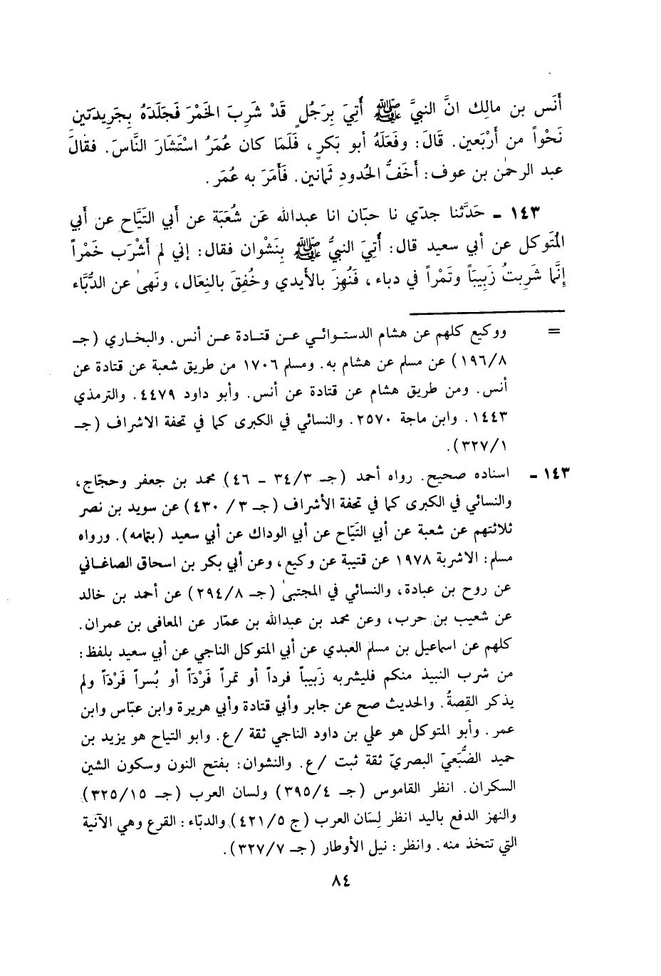 ١٤٣ - حَدَّثَنَا جَدِّي، نَا حِبَّانُ، أَنا عَبْدُ اللَّهِ عَنْ شُعْبَةَ , عَنْ أَبِي التَّيَّاحِ , عَنْ أَبِي الْمُتَوَكِّلِ , عَنْ أَبِي سَعِيدٍ , قَالَ: أُتِيَ النَّبِيُّ صَلَّى اللَّهُ عَلَيْهِ وَسَلَّمَ بِنَشْوَانَ , فَقَالَ: إِنِّي لَمْ أَشْرَبْ خَمْرًا , إِنَّمَا شَرِبْتُ زَبِيبًا وتَمْرًا فِي دُبَّاءٍ , «فَنُهِزَ بِالْأَيْدِي , وَخُفِقَ بِالنِّعَالِ , ونُهِيَ عَنِ الدُّبَّاءِ , ⦗٨٥⦘ وَعَنِ الزَّبِيبِ وَالتَّمْرِ أَنْ يُخْلَطَا»