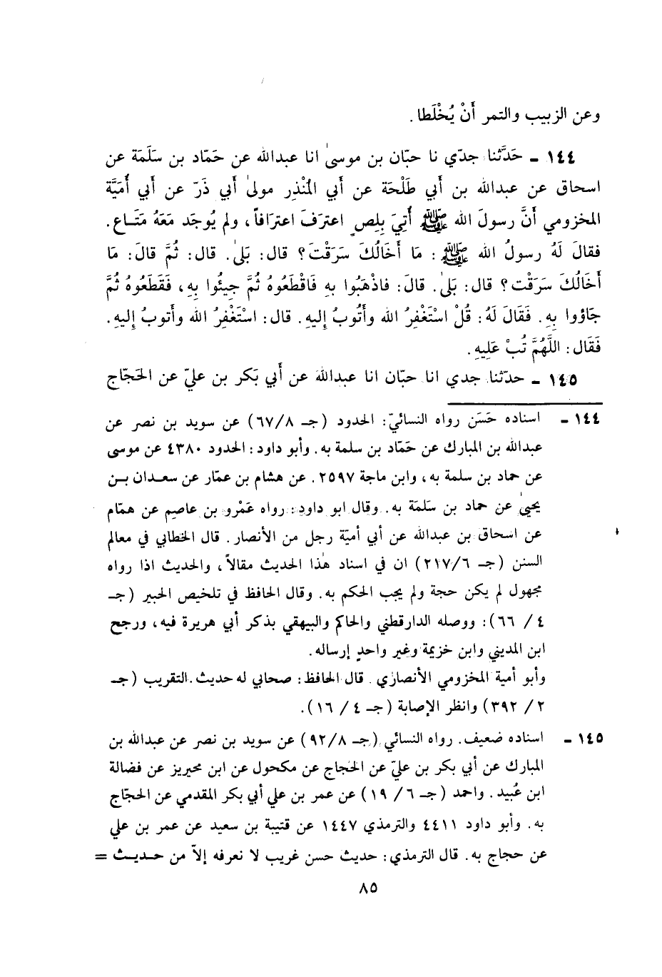 ١٤٤ - حَدَّثَنَا جَدِّي، نَا حِبَّانُ بْنُ مُوسَى، أَنا عَبْدُ اللَّهِ عَنْ حَمَّادِ بْنِ سَلَمَةَ , عَنْ إِسْحَاقَ , عَنْ عَبْدِ اللَّهِ بْنِ أَبِي طَلْحَةَ , عَنْ أَبِي الْمُنْذِرِ مَوْلَى أَبِي ذَرٍّ , عَنْ أَبِي أُمَيَّةَ الْمَخْزُومِيِّ أَنَّ رَسُولَ اللَّهِ صَلَّى اللَّهُ عَلَيْهِ وَسَلَّمَ أُتِيَ بِلِصٍّ اعْتَرَفَ اعْتِرَافًا وَلَمْ يُوجَدْ مَعَهُ مَتَاعٌ , فَقَالَ لَهُ رَسُولُ اللَّهِ صَلَّى اللَّهُ عَلَيْهِ وَسَلَّمَ: «مَا أَخَالُكَ سَرَقْتَ» . قَالَ: بَلَى. قَالَ: ثُمَّ قَالَ: «مَا أَخَالُكَ سَرَقْتَ» . قَالَ: بَلَى. قَالَ: «فَاذْهَبُوا بِهِ فَاقْطَعُوهُ , ثُمَّ جِيئُوا بِهِ» , فَقَطَعُوهُ ثُمَّ جَاءُوا بِهِ , فَقَالَ لَهُ: «قُلْ: أَسْتَغْفِرُ اللَّهَ وَأَتُوبُ إِلَيْهِ» . قَالَ: أَسْتَغْفِرُ اللَّهَ وَأَتُوبُ إِلَيْهِ. فَقَالَ: «اللَّهُمَّ تُبْ عَلَيْهِ»