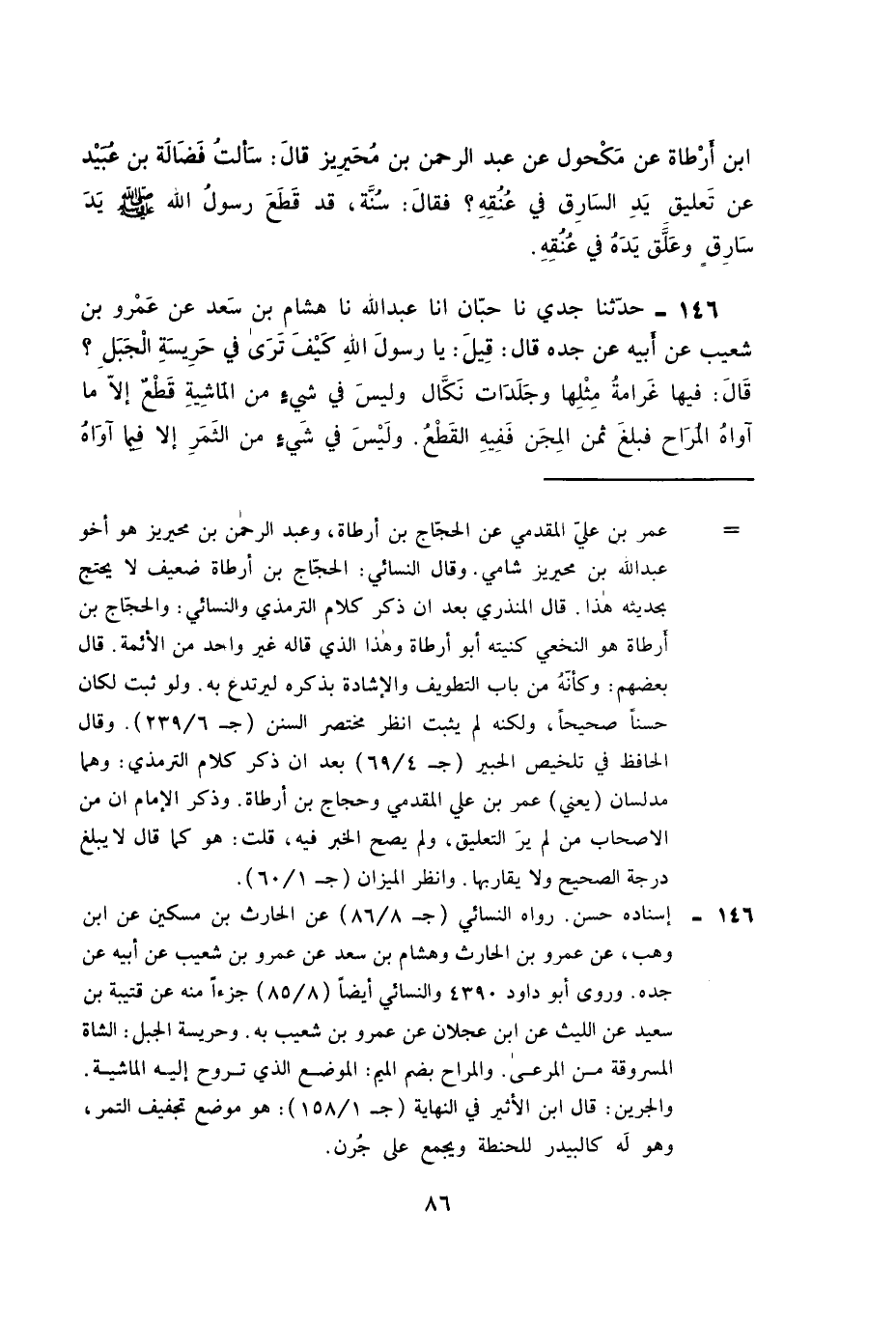 ١٤٦ - حَدَّثَنَا جَدِّي، نَا حِبَّانُ، أَنا عَبْدُ اللَّهِ نَا هِشَامُ بْنُ سَعْدٍ , عَنْ عَمْرِو بْنِ شُعَيْبٍ , عَنْ أَبِيهِ , عَنْ جَدِّهِ , قَالَ: قِيلَ: يَا رَسُولَ اللَّهِ , كَيْفَ تَرَى فِي حَرِيسَةِ الْجَبَلِ؟ قَالَ: «فِيهَا غَرَامَةٌ مِثلُهَا , وَجَلَدَاتُ نَكَالٍ , وَلَيْسَ فِي شَيْءٍ مِنَ الْمَاشِيَةِ قَطْعٌ , إِلَّا مَا أَوَاهُ الْمُرَاحُ , فَبَلَغَ ثَمَنَ الْمِجَنِّ , فَفِيهِ الْقَطْعُ , وَلَيْسَ فِي شَيْءٍ مِنَ الثَّمَرِ إِلَّا فِيمَا أَوَاهُ ⦗٨٧⦘ الْجَرِينُ فَمَا أُخِذَ مِنَ الْجَرِينِ فَبَلَغَ ثَمَنَ الْمِجَنِّ فَفِيهِ الْقَطْعُ»