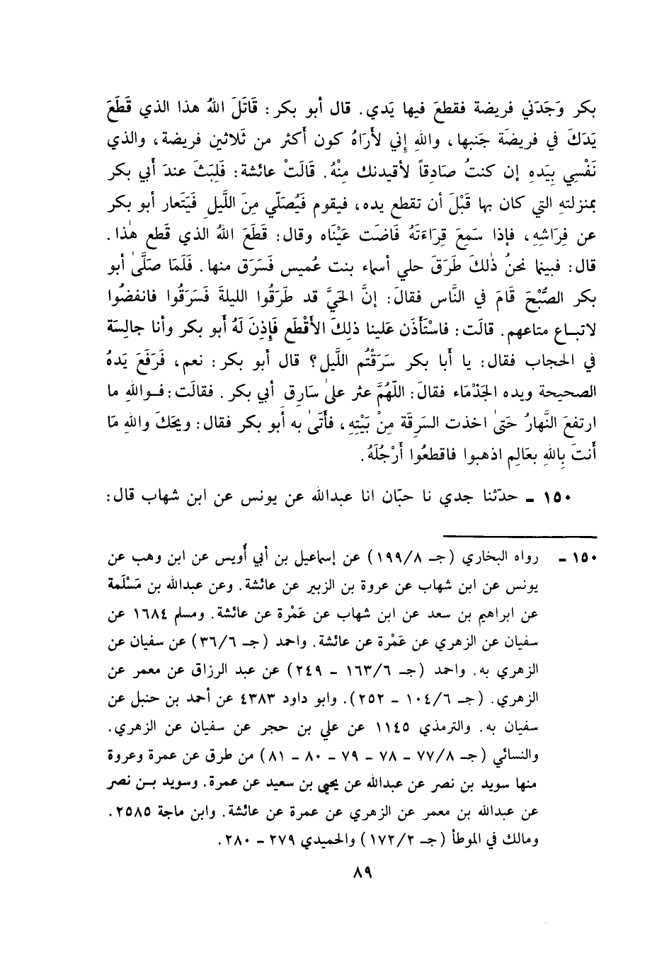 ١٥٠ - حَدَّثَنَا جَدِّي، نَا حِبَّانُ، أَنا عَبْدُ اللَّهِ عَنْ يُونُسَ , عَنِ ابْنِ شِهَابٍ , قَالَ: ⦗٩٠⦘ قَالَتْ عَمْرَةُ بِنْتُ عَبْدِ الرَّحْمَنِ , عَنْ عَائِشَةَ , عَنْ رَسُولِ اللَّهِ صَلَّى اللَّهُ عَلَيْهِ وَسَلَّمَ , أَنَّهُ قَالَ: «تُقْطَعُ يَدُ السَّارِقِ فِي رُبُعِ دِينَارٍ» , حَدَّثَنَا جَدِّي، نَا حِبَّانُ، أَنا عَبْدُ اللَّهِ عَنْ سُفْيَانَ بْنِ عُيَيْنَةَ بِهَذَا الْإِسْنَادِ , عَنِ النَّبِيِّ صَلَّى اللَّهُ عَلَيْهِ وَسَلَّمَ
