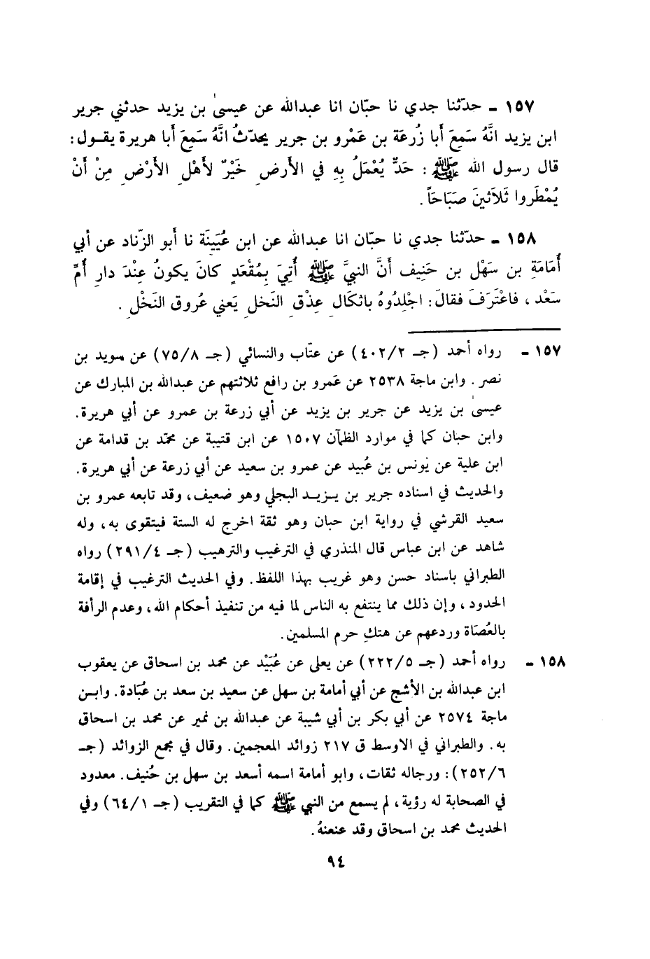 ١٥٨ - حَدَّثَنَا جَدِّي، نَا حِبَّانُ، أَنا عَبْدُ اللَّهِ عَنِ ابْنِ عُيَيْنَةَ , نَا أَبُو الزِّنَادِ , عَنْ أَبِي أُمَامَةَ بْنِ سَهْلِ بْنِ حُنَيْفٍ , أَنَّ النَّبِيَّ صَلَّى اللَّهُ عَلَيْهِ وَسَلَّمَ أُتِيَ بِمُقْعَدٍ كَانَ يَكُونُ عِنْدَ دَارِ أُمِّ سَعْدٍ فَاعْتَرَفَ , فَقَالَ: «اجْلِدُوهُ بِأَثْكَالِ عَذْقِ النَّخْلِ» يَعْنِي عُرُوقَ النَّخْلِ