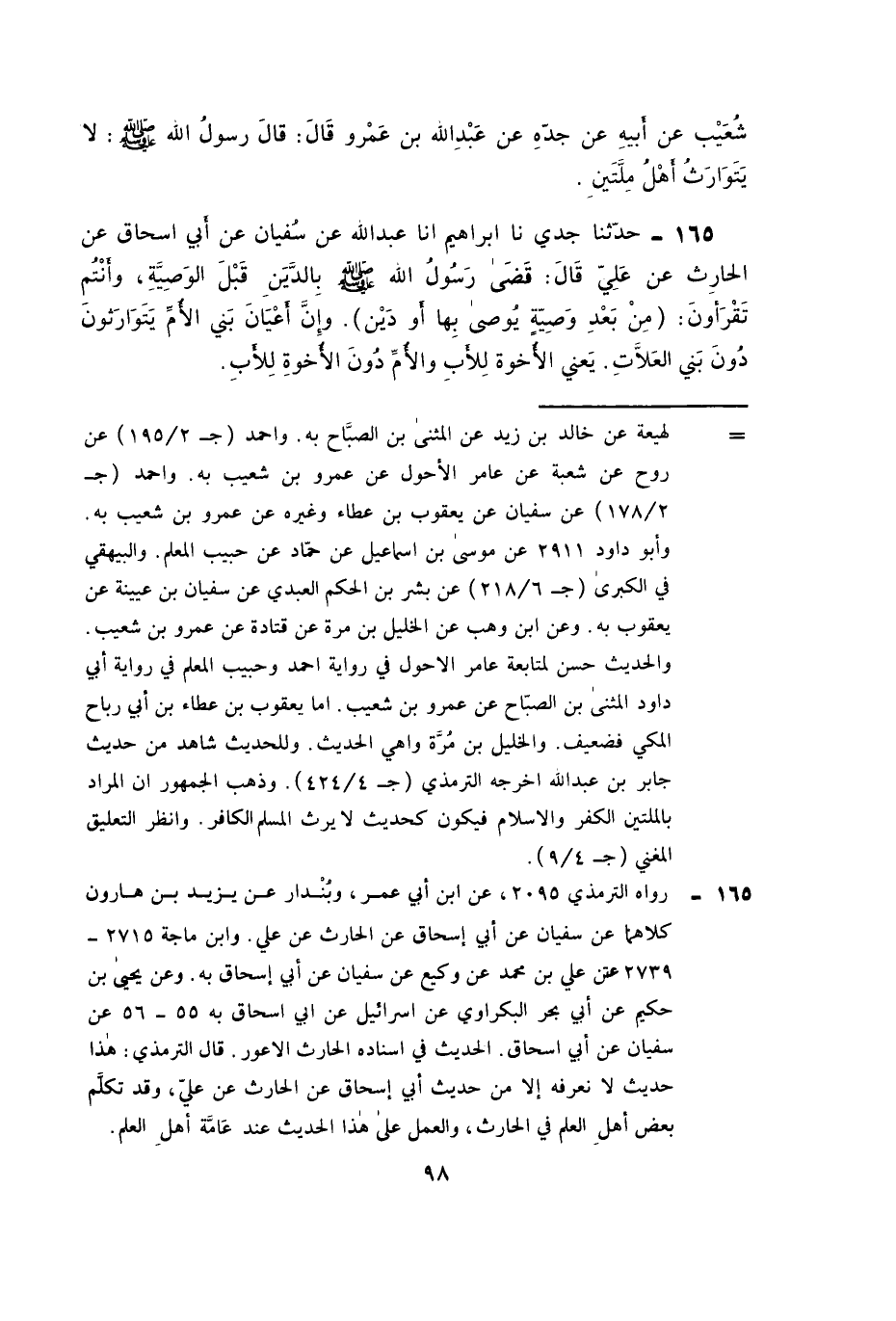 ١٦٥ - حَدَّثَنَا جَدِّي، نَا إِبْرَاهِيمُ، أَنا عَبْدُ اللَّهِ عَنْ سُفْيَانَ , عَنْ أَبِي إِسْحَاقَ , عَنِ الْحَارِثِ , عَنْ عَلِيٍّ , قَالَ: «قَضَى رَسُولُ اللَّهِ صَلَّى اللَّهُ عَلَيْهِ وَسَلَّمَ بِالدَّيْنِ قَبْلَ الْوَصِيَّةِ , وَأَنْتُمْ تَقْرَءُونَ: {مِنْ بَعْدِ وَصِيَّةٍ يُوصَى بِهَا أَوْ دَيْنٍ} [النِّسَاء: ١٢] , وَإِنَّ أَعْيَانَ بَنِي الْأُمِّ يَتَوَارَثُونَ دُونَ بَنِي الْعَلَّاتِ، يَعْنِي الْإِخْوَةَ لِلْأَبِ وَالْأُمِّ دُونَ الْإِخْوَةِ لِلْأَبِ»