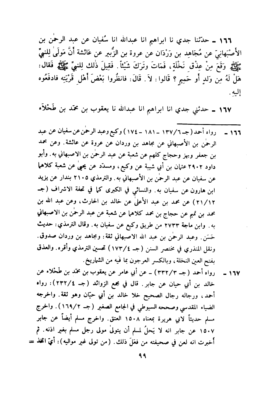١٦٦ - حَدَّثَنَا جَدِّي، نَا إِبْرَاهِيمُ، أَنا عَبْدُ اللَّهِ أَنا سُفْيَانُ , عَنْ عَبْدِ الرَّحْمَنِ بْنِ الْأَصْبَهَانِيِّ , عَنْ مُجَاهِدِ بْنِ وَرْدَانَ , عَنْ عُرْوَةَ بْنِ الزُّبَيْرِ , عَنْ عَائِشَةَ , أَنَّ مَولًى لِلنَّبِيِّ صَلَّى اللَّهُ عَلَيْهِ وَسَلَّمَ وَقَعَ مِنْ عَذْقِ نَخْلَةٍ فَمَاتَ وَتَرَكَ شَيْئًا , فَقِيلَ ذَلِكَ لِلنَّبِيِّ صَلَّى اللَّهُ عَلَيْهِ وَسَلَّمَ , فَقَالَ: «هَلْ لَهُ مِنْ وَلَدٍ أَوْ حَمِيمٍ؟» قَالُوا: لَا. قَالَ: «فَانْظُرُوا بَعْضَ أَهْلِ قَرَيْتِهِ , فَادْفَعُوهُ إِلَيْهِ»