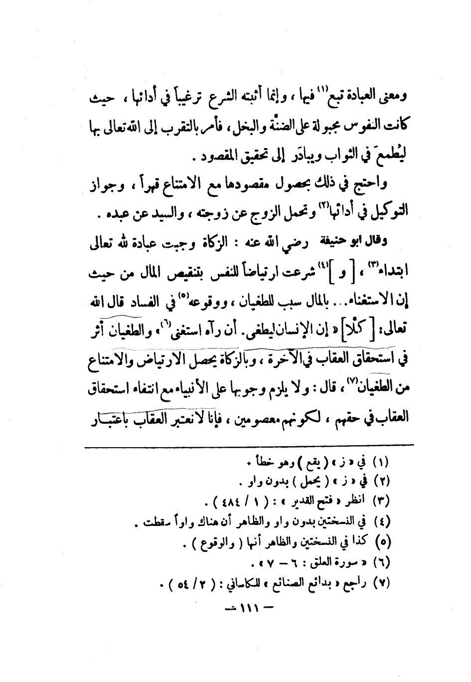وَقَالَ أَبُو حنيفَة رض الزَّكَاة وَجَبت عبَادَة لله تَعَالَى ابْتِدَاء وشرعت ارتياضا للنَّفس بتنقيص المَال من حَيْثُ إِن الِاسْتِغْنَاء بِالْمَالِ سَبَب للطغيان ووقوعه فِي الْفساد قَالَ الله تَعَالَى {كلا إِن الْإِنْسَان ليطْغى أَن رَآهُ اسْتغنى} والطغيان أثر فِي اسْتِحْقَاق الْعقَاب فِي الْآخِرَة وبالزكاة يحصل الإرتياض والامتناع من الطغيان قَالَ وَلَا يلْزم وُجُوبهَا على الْأَنْبِيَاء مَعَ إنتفاء اسْتِحْقَاق الْعقَاب فِي حَقهم لكَوْنهم معصومين فَإنَّا لَا نعتبر الْعقَاب بِاعْتِبَار