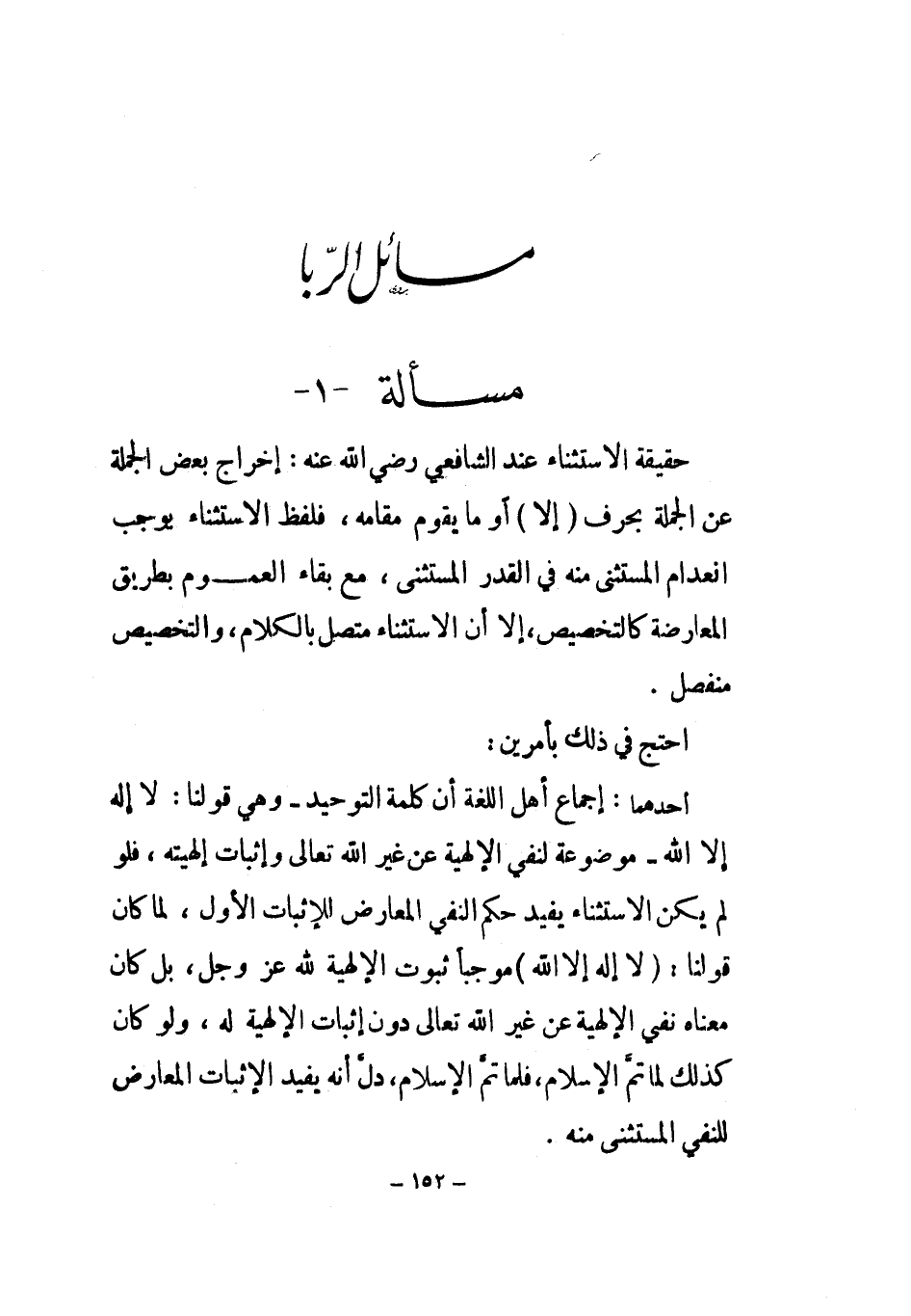 أَحدهمَا إِجْمَاع أهل اللُّغَة أَن كلمة التَّوْحِيد وَهِي قَوْلنَا لَا اله إِلَّا الله مَوْضُوعَة لنفي الإلهية عَن غير الله تَعَالَى وَإِثْبَات إلهيته فَلَو لم يكن الِاسْتِثْنَاء يُفِيد حكم النَّفْي الْمعَارض للإثبات الأول لما كَانَ قَوْلنَا لَا اله إِلَّا الله مُوجبا ثُبُوت الإلهية لله عز وَجل بل كَانَ مَعْنَاهُ نفي الإلهية عَن غير الله تَعَالَى دون إِثْبَات الإلهية لَهُ وَلَو كَانَ كَذَلِك لما تمّ الْإِسْلَام فَلَمَّا تمّ الْإِسْلَام دلّ أَنه يُفِيد الْإِثْبَات الْمعَارض للنَّفْي الْمُسْتَثْنى مِنْهُ