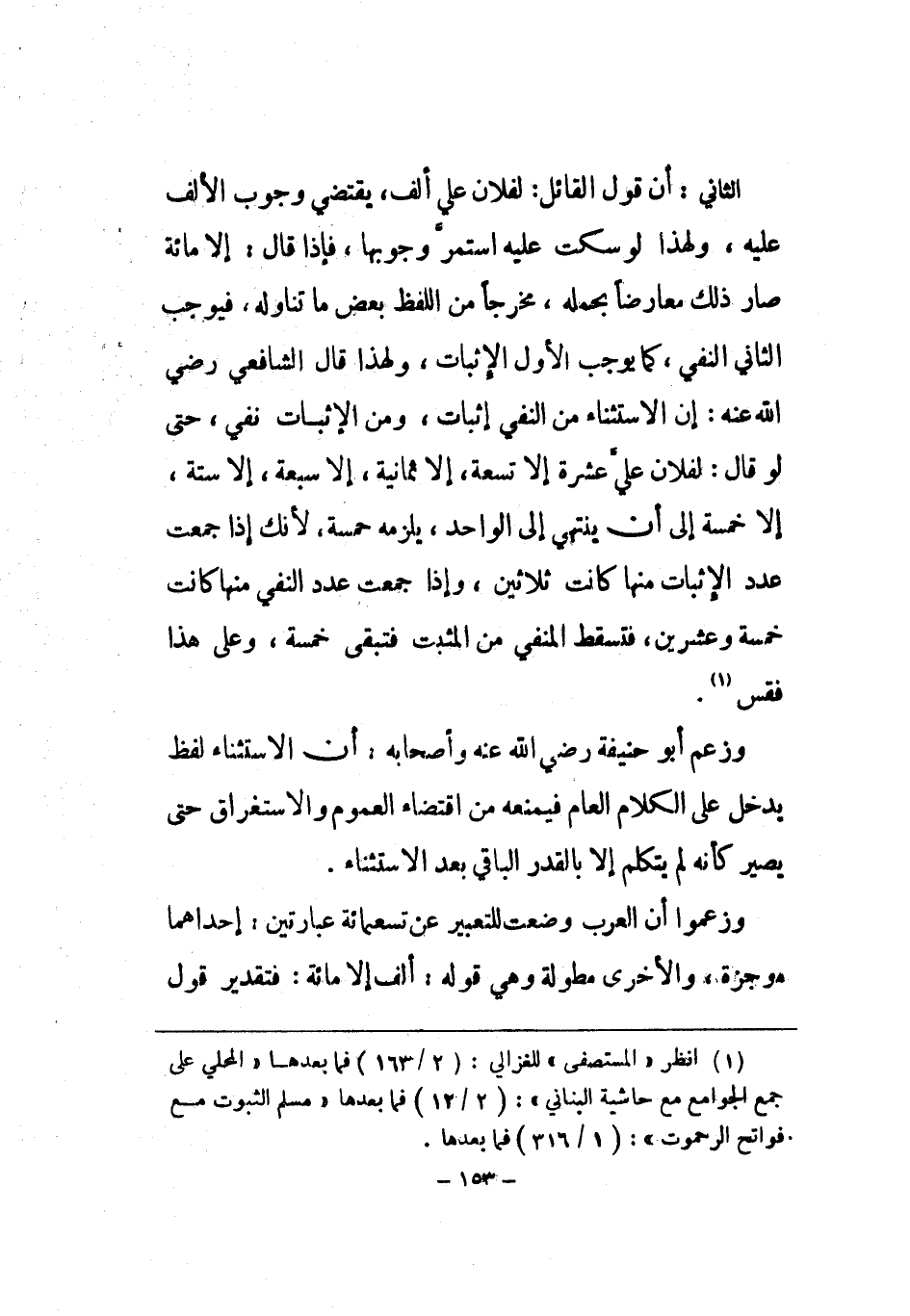 الثَّانِي إِن قَول الْقَائِل لفُلَان عَليّ ألف يَقْتَضِي وجوب الْألف عَلَيْهِ وَلِهَذَا لَو سكت عَلَيْهِ اسْتمرّ وُجُوبهَا فَإِذا قَالَ إِلَّا مائَة صَار ذَلِك مُعَارضا بِحمْلِهِ مخرجا من اللَّفْظ بعض مَا تنَاوله فَيُوجب الثَّانِي النَّفْي كَمَا يُوجب الأول الْإِثْبَات وَلِهَذَا قَالَ الشَّافِعِي رض إِن الِاسْتِثْنَاء من النَّفْي إِثْبَات وَمن الْإِثْبَات نفي حَتَّى لَو قَالَ لفُلَان عَليّ عشرَة إِلَّا تِسْعَة إِلَّا ثَمَانِيَة إِلَّا سَبْعَة إِلَّا سِتَّة إِلَّا خَمْسَة إِلَى أَن يَنْتَهِي إِلَى الْوَاحِد يلْزمه خَمْسَة لِأَنَّك إِذا جمعت عدد الْإِثْبَات مِنْهَا كَانَت ثَلَاثِينَ وَإِذا جمعت عدد النَّفْي مِنْهَا كَانَت خَمْسَة وَعشْرين فَتسقط الْمَنْفِيّ من الْمُثبت فَتبقى خَمْسَة وعَلى هَذَا فقس