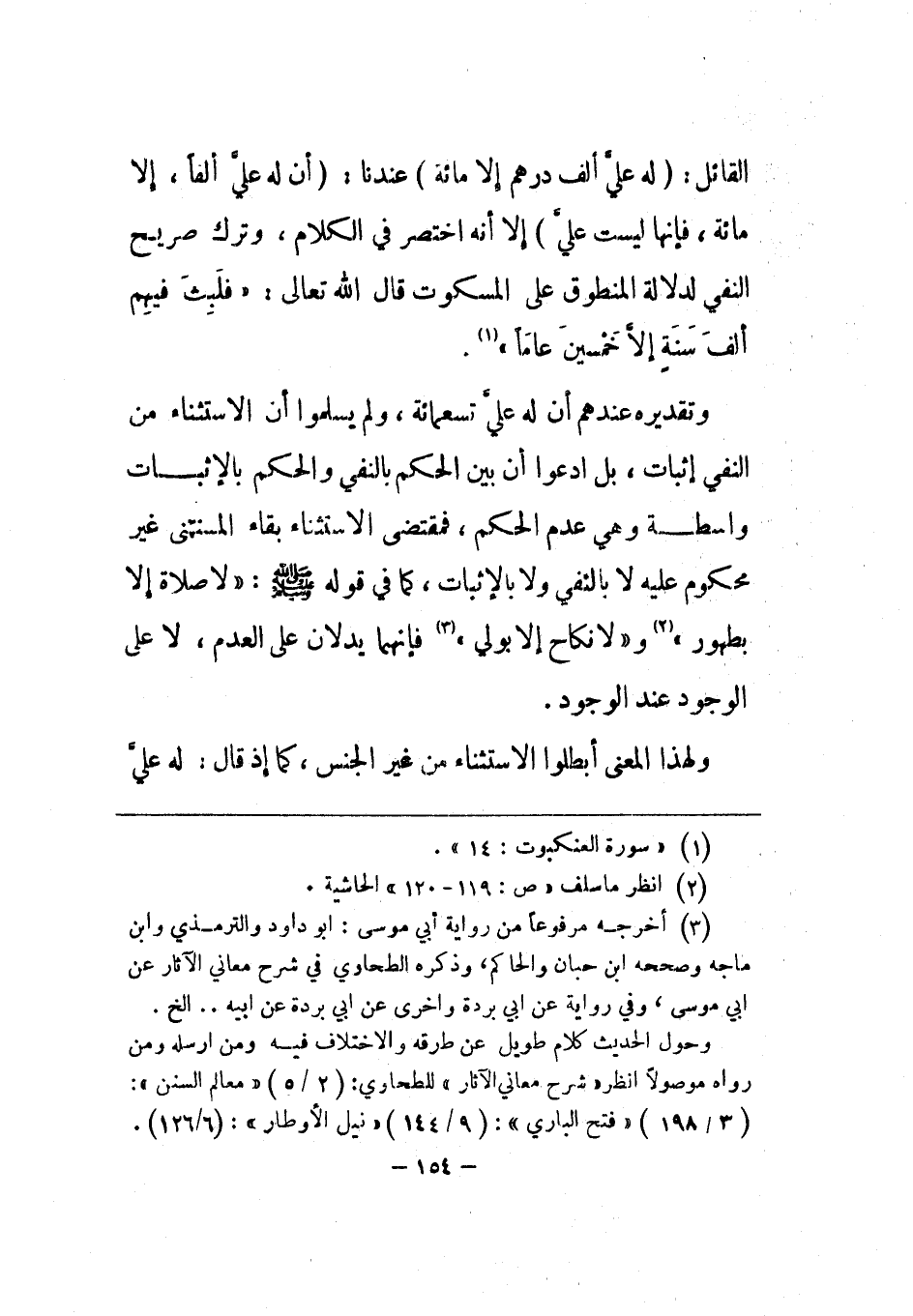 وَتَقْدِيره عِنْدهم أَن لَهُ عَليّ تِسْعمائَة وَلم يسلمُوا أَن الِاسْتِثْنَاء من النَّفْي إِثْبَات بل أَدْعُو أَن بَين الحكم بِالنَّفْيِ وَالْحكم بالإثبات وَاسِطَة وَهِي عدل الحكم فَمُقْتَضى الِاسْتِثْنَاء بَقَاء الْمُسْتَثْنى غير مَحْكُوم عَلَيْهِ لَا بِالنَّفْيِ وَلَا بالإثبات كَمَا فِي قَوْله صلى الله عَلَيْهِ وَسلم لَا صَلَاة إِلَّا بِطهُور وَلَا نِكَاح إِلَّا بولِي فَإِنَّهُمَا يدلان على الْعَدَم لَا على الْوُجُود عِنْد الْوُجُود