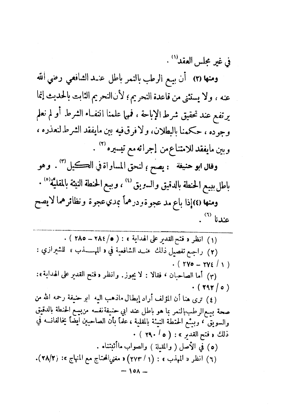 وَمِنْهَا إِن بيع الرطب بِالتَّمْرِ بَاطِل عِنْد الشَّافِعِي رض وَلَا يسْتَثْنى من قَاعِدَة التَّحْرِيم لِأَن التَّحْرِيم الثَّابِت بِالْحَدِيثِ إِنَّمَا يرْتَفع عِنْد تَحْقِيق شَرط الْإِبَاحَة فمهما علمنَا انْتِفَاء الشَّرْط أَو لم نعلم وجوده حكمنَا بِالْبُطْلَانِ وَلَا فرق فِيهِ بَين مَا يفقد الشَّرْط لنعذره وَبَين مَا يفقد للإمتناع من إجرائه مَعَ تيسيره
