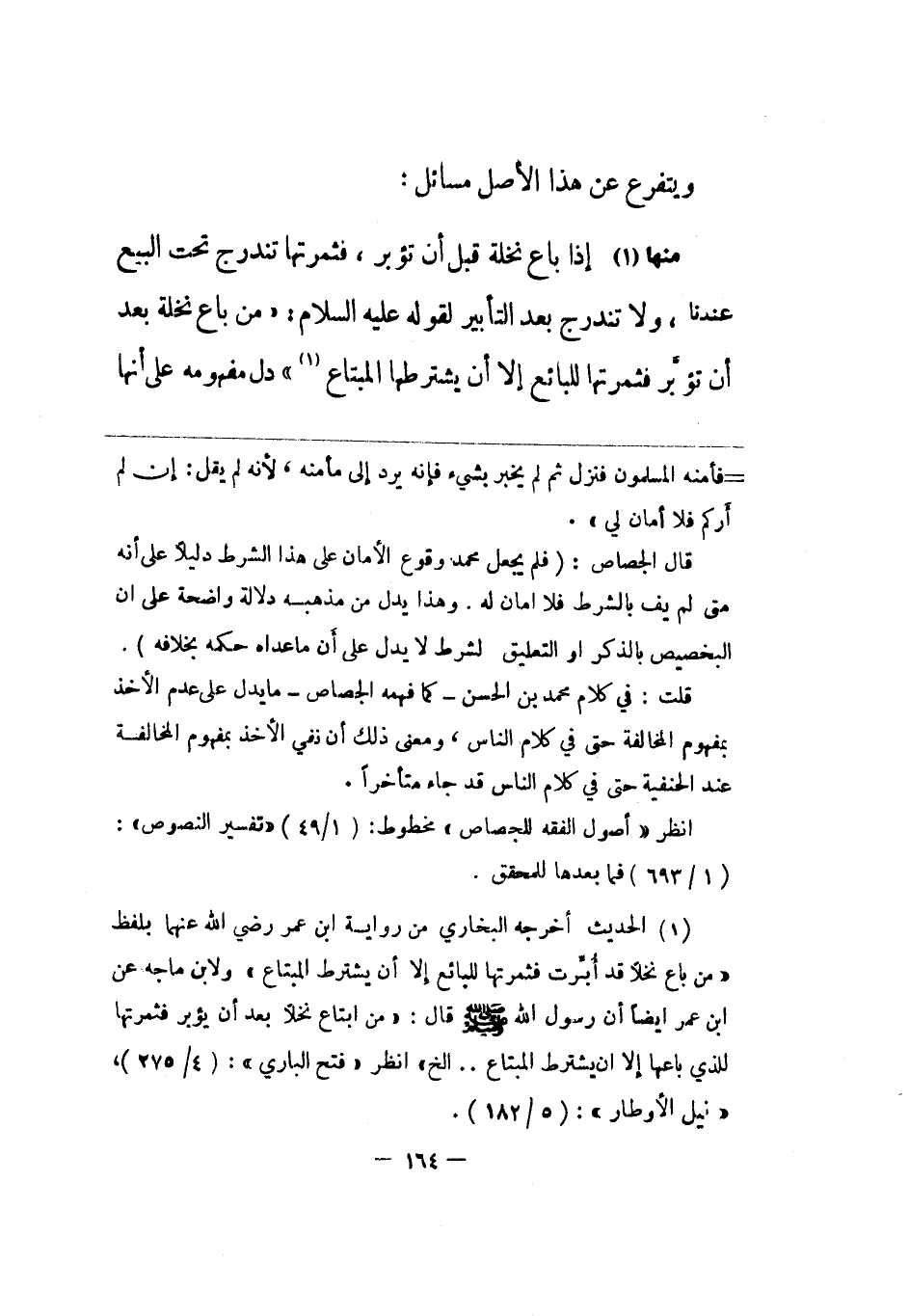 مِنْهَا إِذا بَاعَ نَخْلَة قبل أَن تؤبر فثمرتها تندرج تَحت البيع عندنَا وَلَا تندرج بعد التَّأْبِير لقَوْله عَلَيْهِ السَّلَام من بَاعَ نَخْلَة بعد إِن تؤبر فثمرتها للْبَائِع إِلَّا أَن يشترطها الْمُبْتَاع // الحَدِيث أخرجه البُخَارِيّ دلّ مَفْهُومه على أَنَّهَا