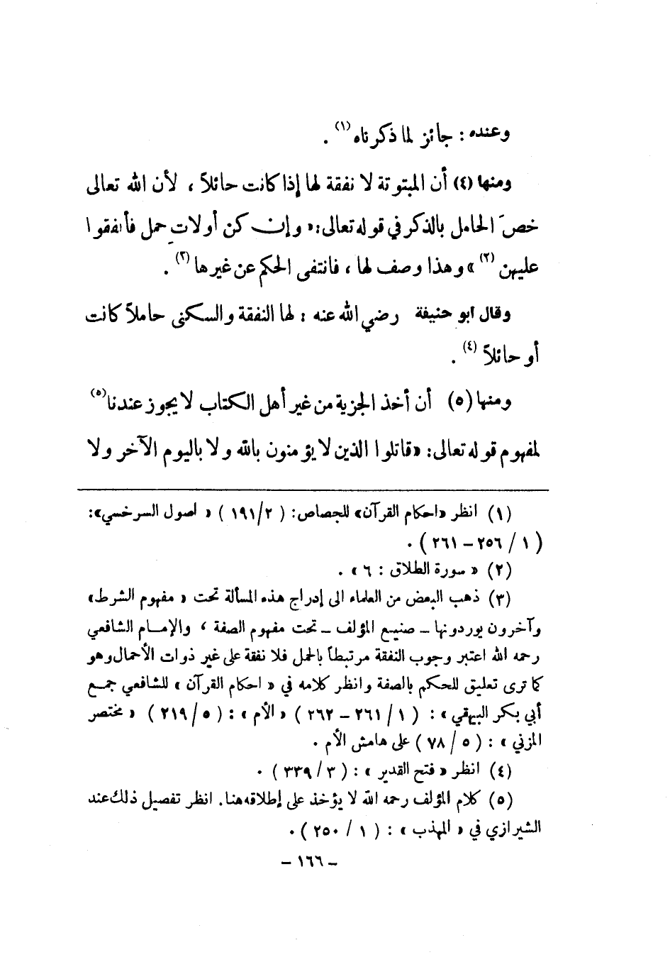 وَمِنْهَا أَن المبتوتة لَا نَفَقَة لَهَا إِذا كَانَت حَائِلا لِأَن الله تَعَالَى خص الْحَامِل بِالذكر فِي قَوْله تَعَالَى {وَإِن كن أولات حمل فأنفقوا عَلَيْهِنَّ} وَهَذَا وصف لَهَا فَانْتفى الحكم عَن غَيرهَا