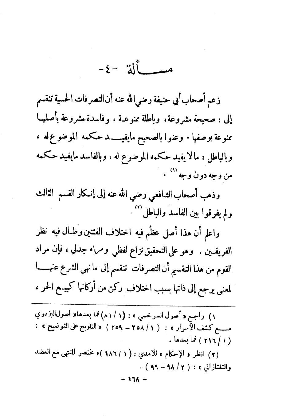 زعم أَصْحَاب أبي حنيفَة رض أَن التَّصَرُّفَات الحسية تَنْقَسِم إِلَى صَحِيحَة ومشروعة وباطلة وممنوعة وفاسدة ومشروعة بأصلها مَمْنُوعَة بوصفها وعنوا بِالصَّحِيحِ مَا يُفِيد حكمه الْمَوْضُوع لَهُ وبالباطل مَا لَا يُفِيد حكمه الْمَوْضُوع لَهُ وبالفاسد مَا يُفِيد حكمه من وَجه دون وَجه