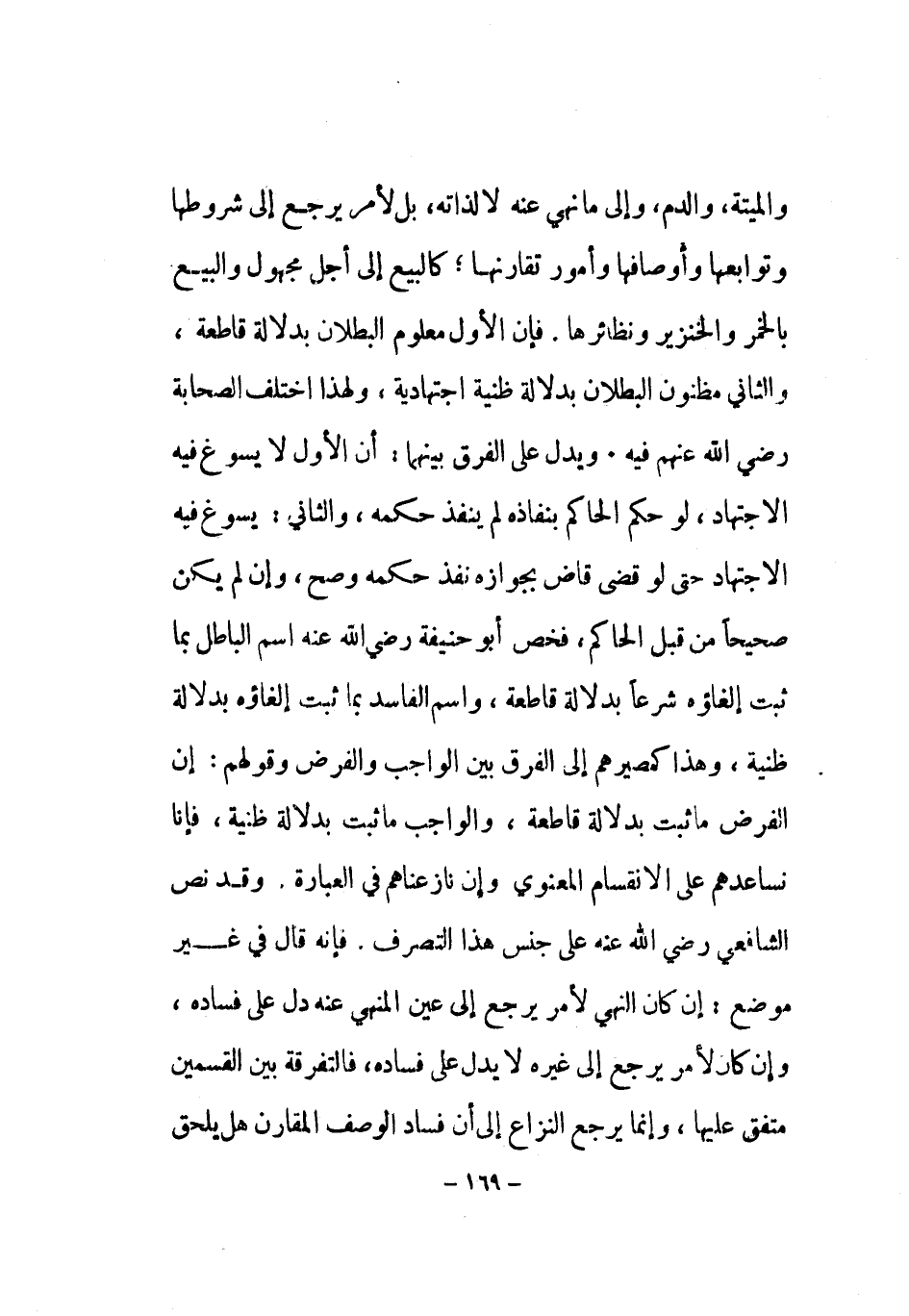 وَالْميتَة وَالدَّم إِلَى مَا نهي عَنهُ لَا لذاته بل لأمر يرجع إِلَى شُرُوطهَا وتوابعها وأوصافها وَأُمُور تقارنها كَالْبيع إِلَى أجل مَجْهُول وَالْبيع بِالْخمرِ وَالْخِنْزِير ونظائرها فَإِن الأول مَعْلُوم الْبطلَان بِدلَالَة قَاطِعَة وَالثَّانِي مظنون الْبطلَان بِدلَالَة ظنية اجتهادية وَلِهَذَا أختلف الصَّحَابَة رض الله عَنْهُم فِيهِ وَبدل على الْفرق بَينهمَا أَن الأول لَا يسوغ فِيهِ الِاجْتِهَاد لَو حكم الْحَاكِم بنفاذه لم ينفذ حكمه وَالثَّانِي يسوغ فِيهِ الِاجْتِهَاد حَتَّى لَو قضى قَاض بِجَوَازِهِ نفذ حكمه وَصَحَّ وَإِن لم يكن صَحِيحا من قبل الْحَاكِم فَخص أَبُو حنيفَة رض أسم الْبَاطِل بِمَا ثَبت إلغائه شرعا بِدلَالَة قَاطِعَة وَاسم الْفَاسِد بِمَا ثَبت إلغاؤه بِدلَالَة ظنية وَهَذَا كمصيرهم إِلَى الْفرق بَين الْوَاجِب وَالْفَرْض وَقَوْلهمْ أَن الْفَرْض مَا ثَبت بِدلَالَة قَاطِعَة وَالْوَاجِب مَا ثَبت بِدلَالَة ظنية فَإنَّا نساعدهم على الانقسام الْمَعْنَوِيّ وَأَن نازعناهم فِي الْعبارَة وَقد نَص الشَّافِعِي رض على جنس هَذَا التَّصَرُّف فانه قَالَ فِي غير مَوضِع إِن كَانَ النَّهْي لأمر يرجع إِلَى عين الْمنْهِي عَنهُ دلّ على فَسَاده وان كَانَ لأمر يرجع إِلَى غَيره لَا يدل على فَسَاده فالتفرقة بَين الْقسمَيْنِ مُتَّفق عَلَيْهَا وَإِنَّمَا يرجع النزاع إِلَى أَن فَسَاد الْوَصْف الْمُقَارن هَل يلْحق