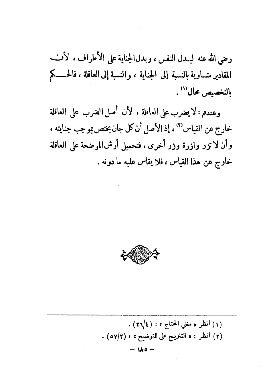 وَعِنْدهم لَا يضْرب على الْعَاقِلَة لِأَن أصل الضَّرْب على الْعَاقِلَة خَارج عَن الْقيَاس إِذْ الأَصْل أَن كل جَان يخْتَص بِمُوجب جِنَايَته وَأَن لَا تزر وَازِرَة وزر أُخْرَى فتحميل أرش الْمُوَضّحَة على الْعَاقِلَة خَارج عَن هَذَا الْقيَاس فَلَا يُقَاس عَلَيْهِ مَا دونه