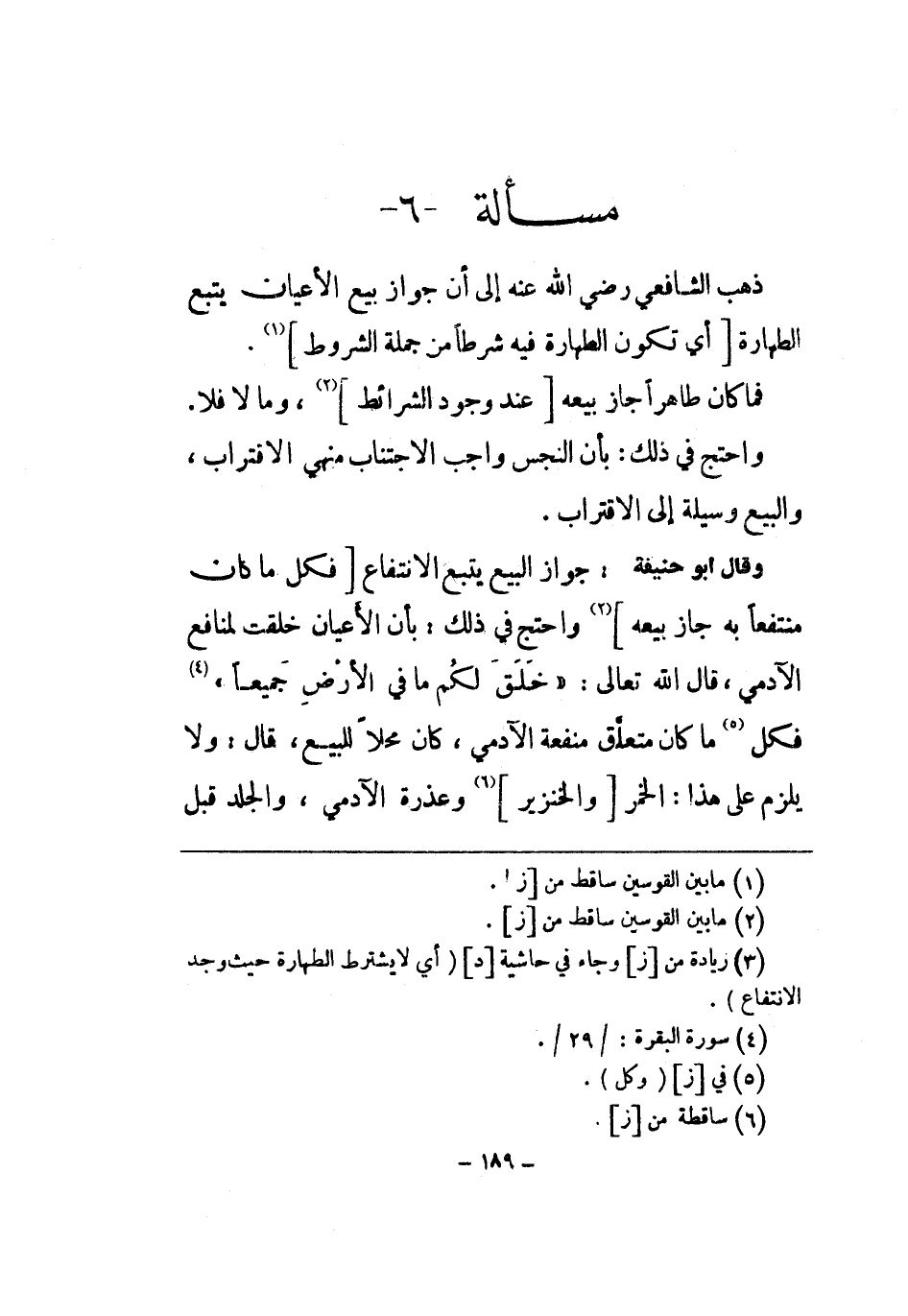 ذهب الشَّافِعِي رض إِلَى أَن جَوَاز بيع الْأَعْيَان يتبع الطَّهَارَة أَي تكون الطَّهَارَة فِيهِ شرطا من جملَة الشُّرُوط