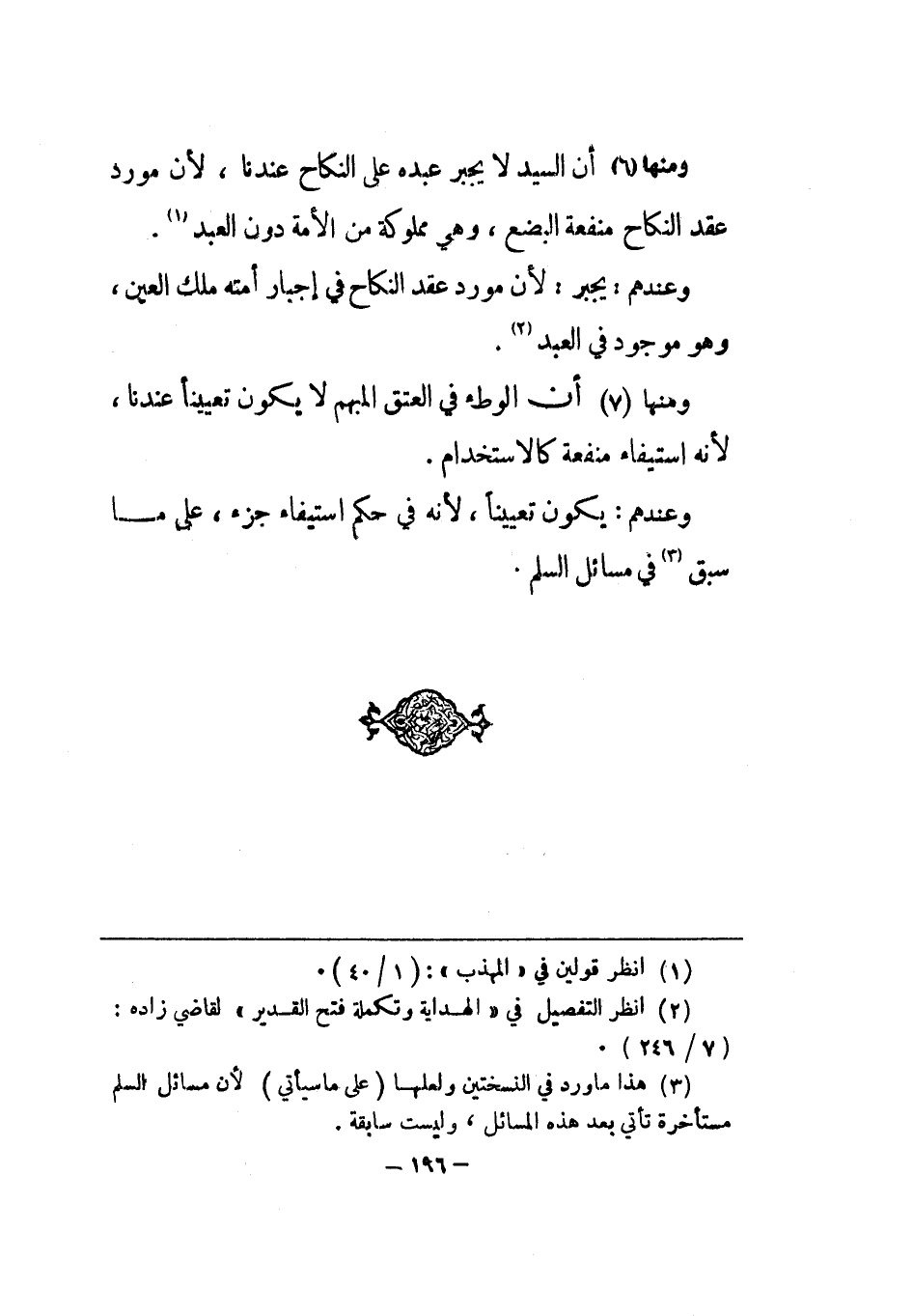 وَمِنْهَا أَن السَّيِّد لَا يجْبر عَبده على النِّكَاح عندنَا لِأَن مورد عقد النِّكَاح مَنْفَعَة الْبضْع وَهِي مَمْلُوكَة من الْأمة دون العَبْد